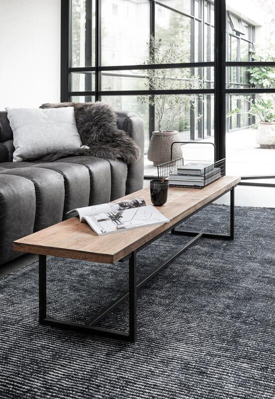 Stoere industriële teak salontafel van oud recycled teak en stalen poten, gemaakt van hetzelfde hout als onze Ferro tafel maar dan met een iets ranker blad. Leverbaar doorgaans direct uit voorraad in 2 maten.