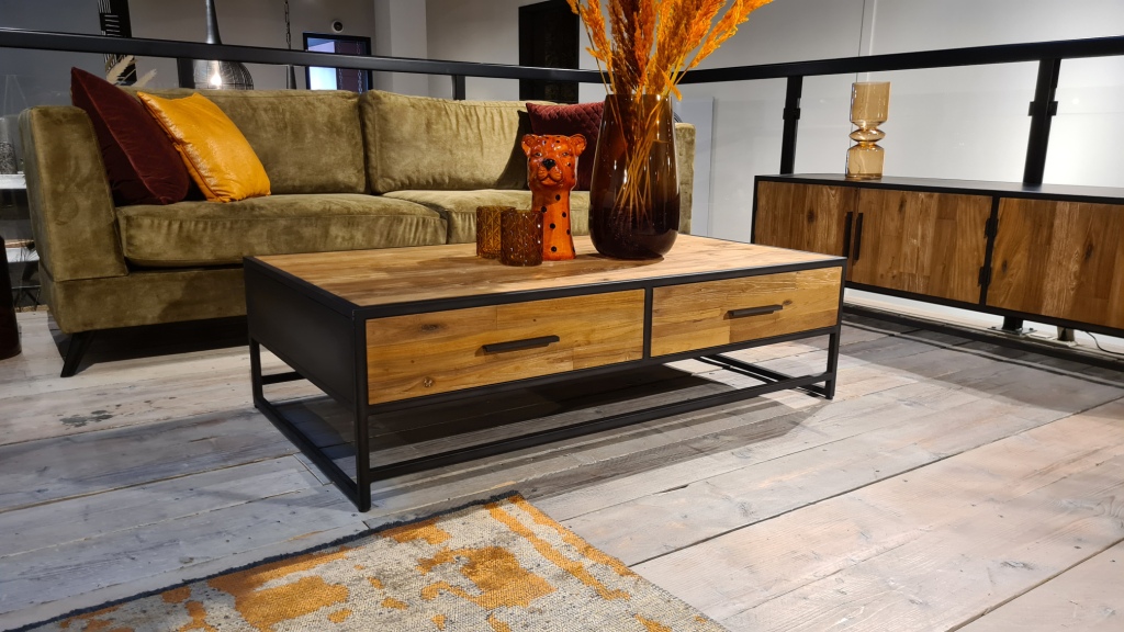 Salontafel Setubal met 4 laden, gemaakt van oud recycled teak en stalen poten. Dit model combineert mooi met onze overige meubels van oud recycled teak.