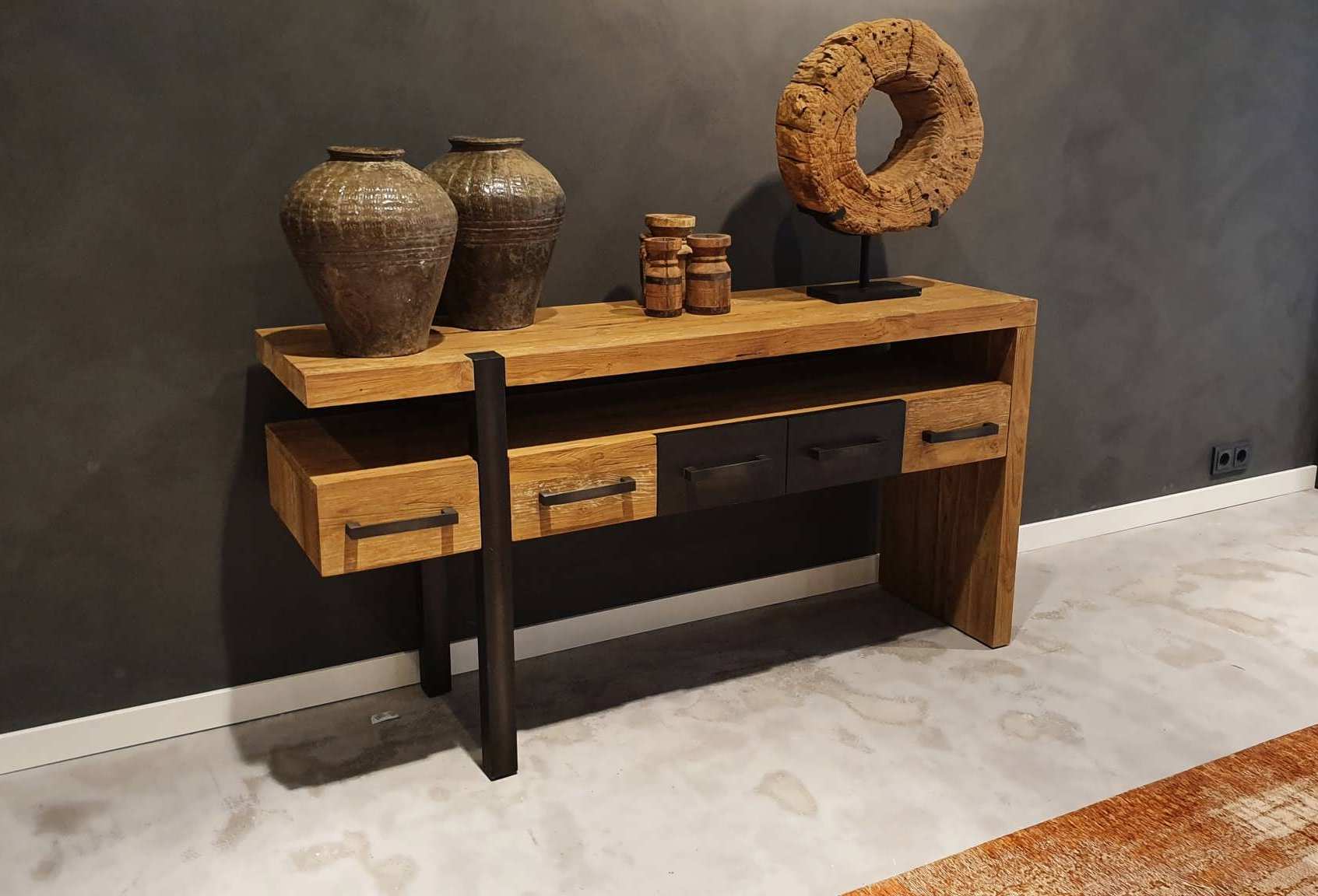 Onze meubels van recycled teak combineren heel mooi met de vele meubelen in oud hout welke we aanbieden. Of het nu een oud eiken eettafel of salontafel is, het oude hout met doorleefde uitstraling zal een fantastische combinatie zijn met deze handgemaakte meubels. Het combineren met onze andere series van teakhout is goed mogelijk met dit model.