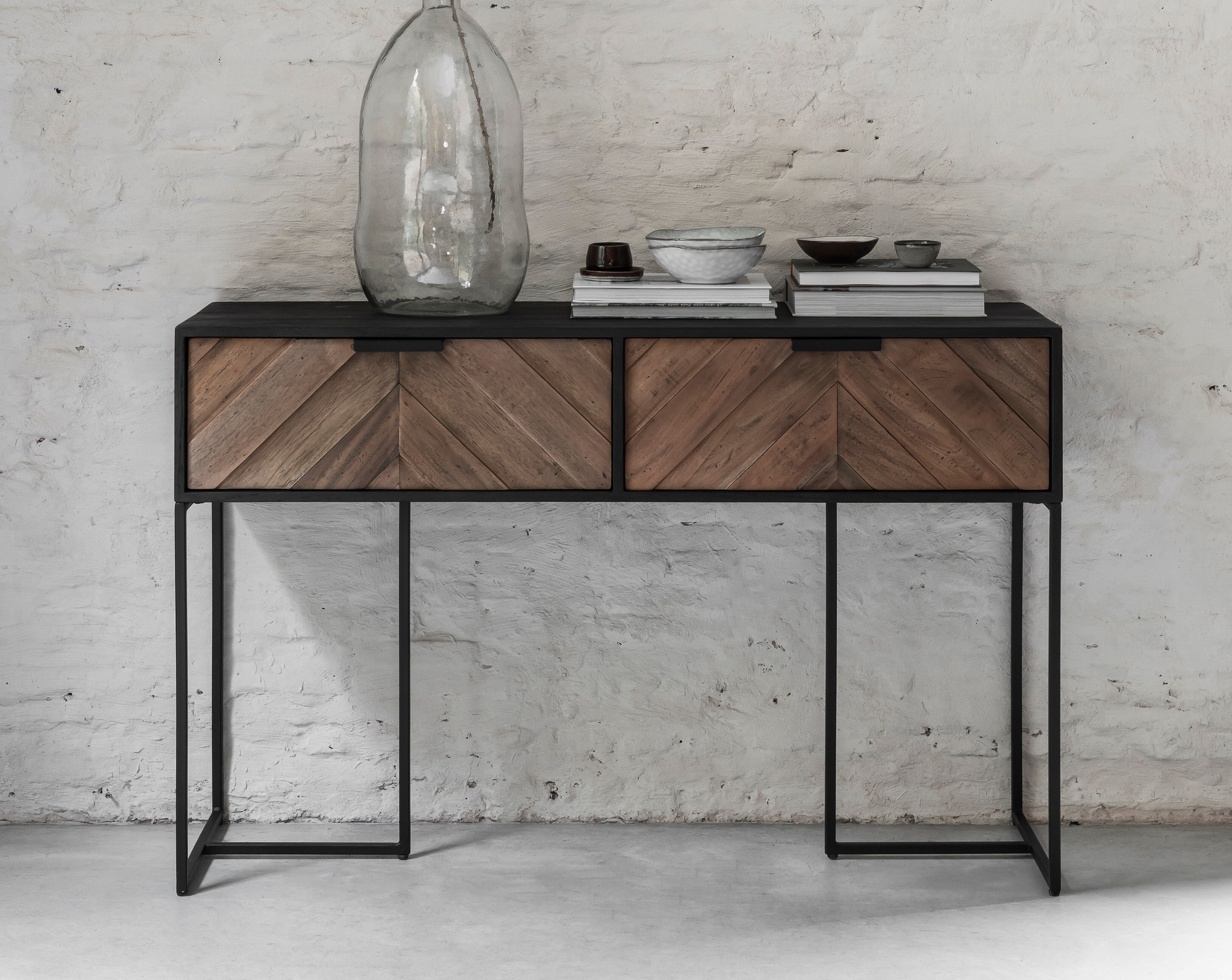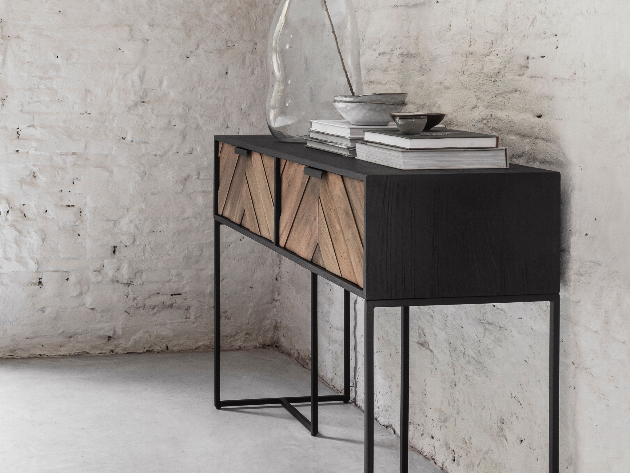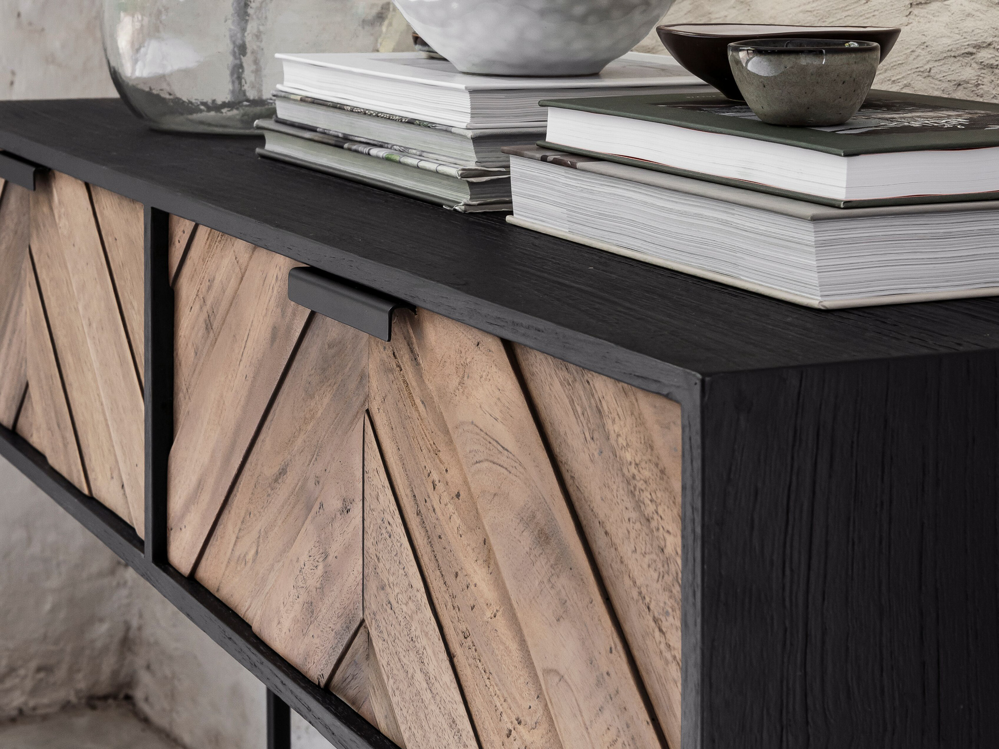 Stoere side table van oud teak met laden, leverbaar doorgaans uit voorraad in 2 maten. De sidetable van 120cm heeft 2 laden, de side table van 160cm heeft 3 laden. De Padula serie is uniek doordat de teak planken in visgraat motief zijn geplaast om zo het meubel een karakteristiek uiterlijk te geven. De combinatie van het zwart gebeitste hout en het oude gerecyclede teak zorgt voor een erg warme uitstraling.