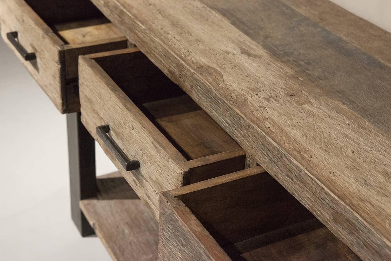 De hand gesmede handgrepen van deze meubels maken een mooi contrast en geeft het geheel net dat industriële tintje. Houd rekening met de grofheid van het hout, hoewel de planken netjes schoongeborsteld worden en ontdaan van schroeven en spijkers zal het hout nooit geheel splinter vrij zijn, iets wat natuurlijk ook het hout zijn eigen charme geeft.