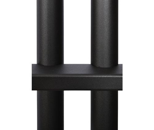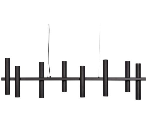 Mooie ranke industriële hanglamp met 8 kokkers en 10 lichtpunten, de buitenste kokers hebben ook een lichtpunt aan de bovenkant. Gemaakt van zwart staal met een matte finish met een GU10 fitting, deze lamp leveren we standaard inclusief de lichtbronnen. Deze lamp hangt in onze showroom in Sliedrecht. Dit model komt standaard met zwarte staalkabels en zwarte kabelspanner.