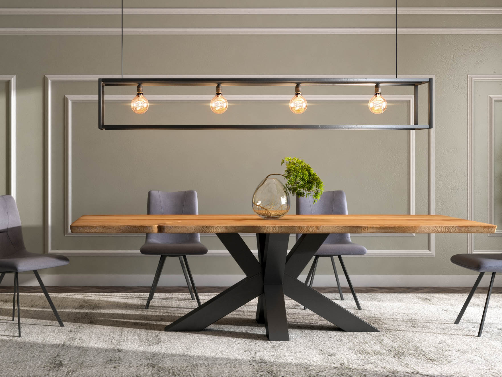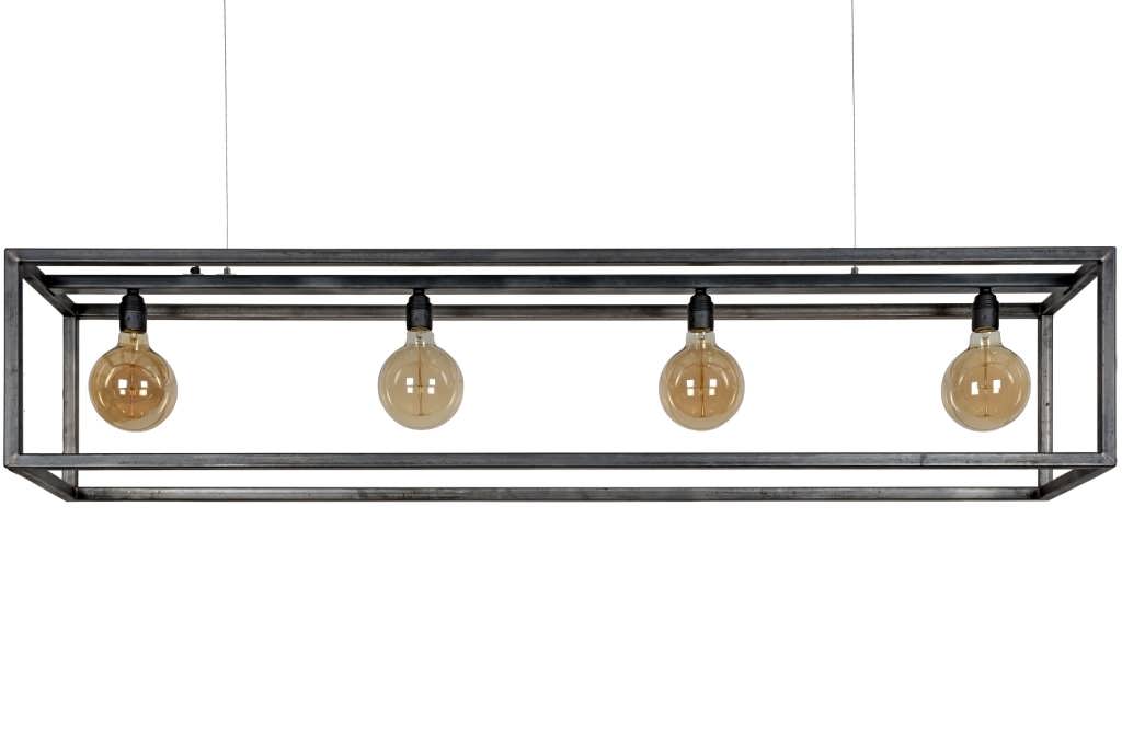 Stoere industriële hanglamp van 150x30x30cm. Gemaakt van donker staal met een matte finish en plaats voor 4 lichtbronnen met E27 (grote) fitting. Leverbaar met diverse type lichtbronnen. Deze lamp hangt in onze showroom in Sliedrecht.