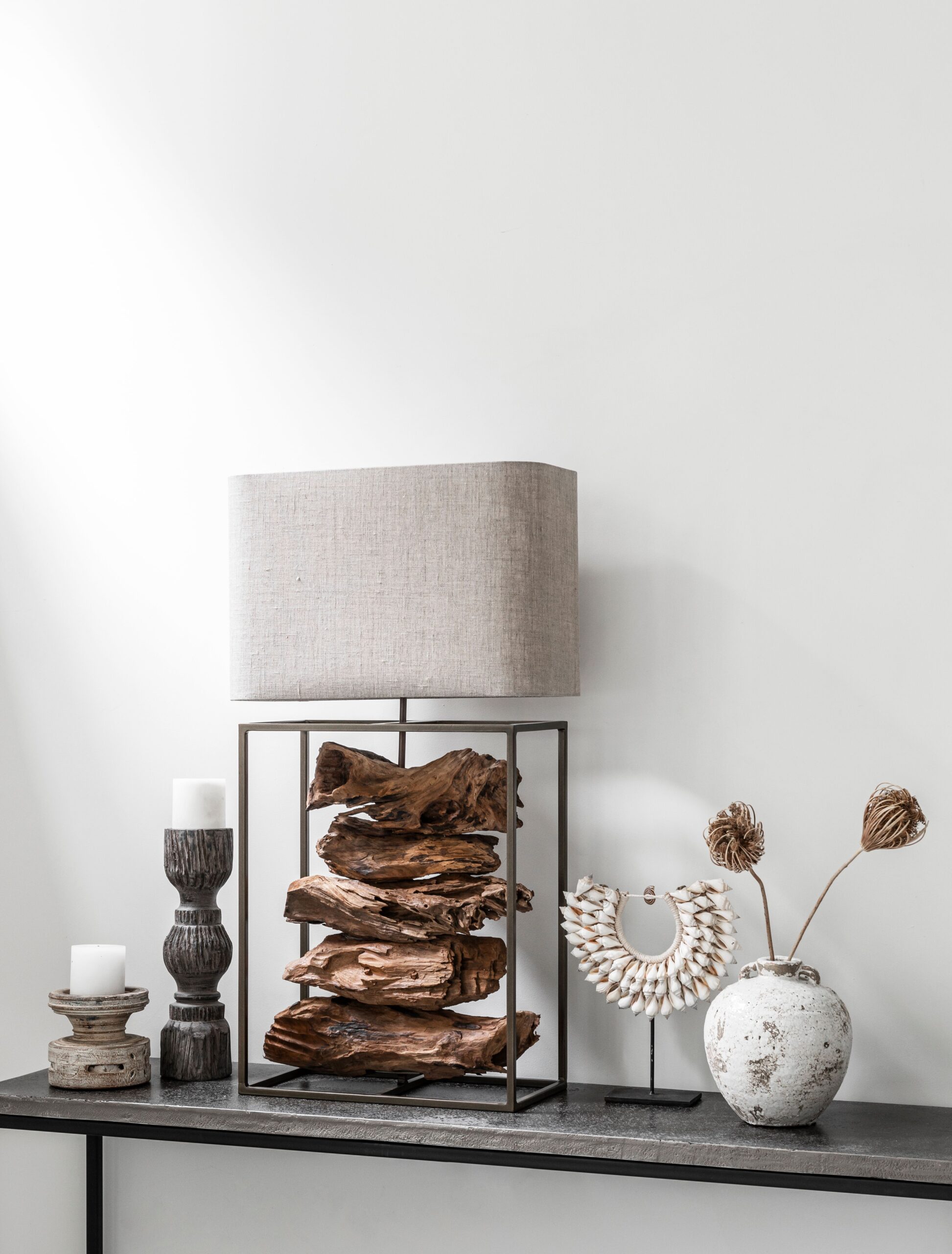 Industriële tafellamp Staple heeft zijn uniekheid te danken aan het kronkelende teakhout dat in iedere lamp anders is. Daarnaast wordt het teakhout gecombineerd met een industrieel frame. De afmetingen van de tafellamp Staple zijn 54x20x76cm.