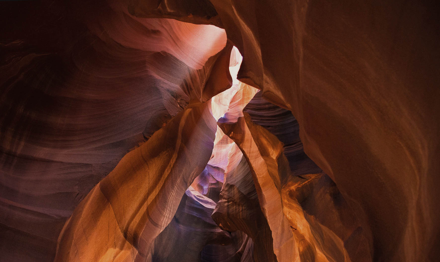 Een klif tussen 2 bergen waar zonlicht doorheen schijnt.