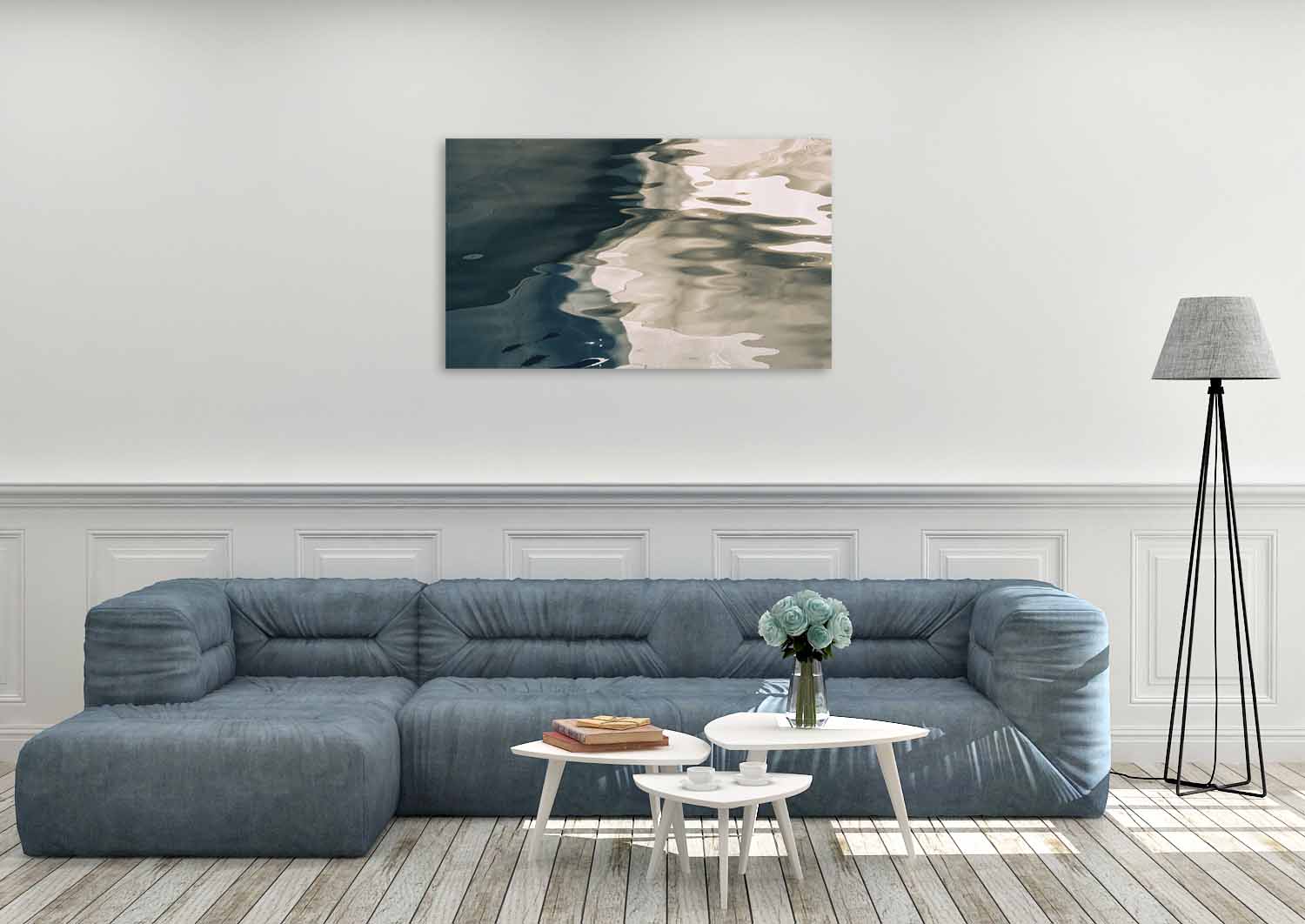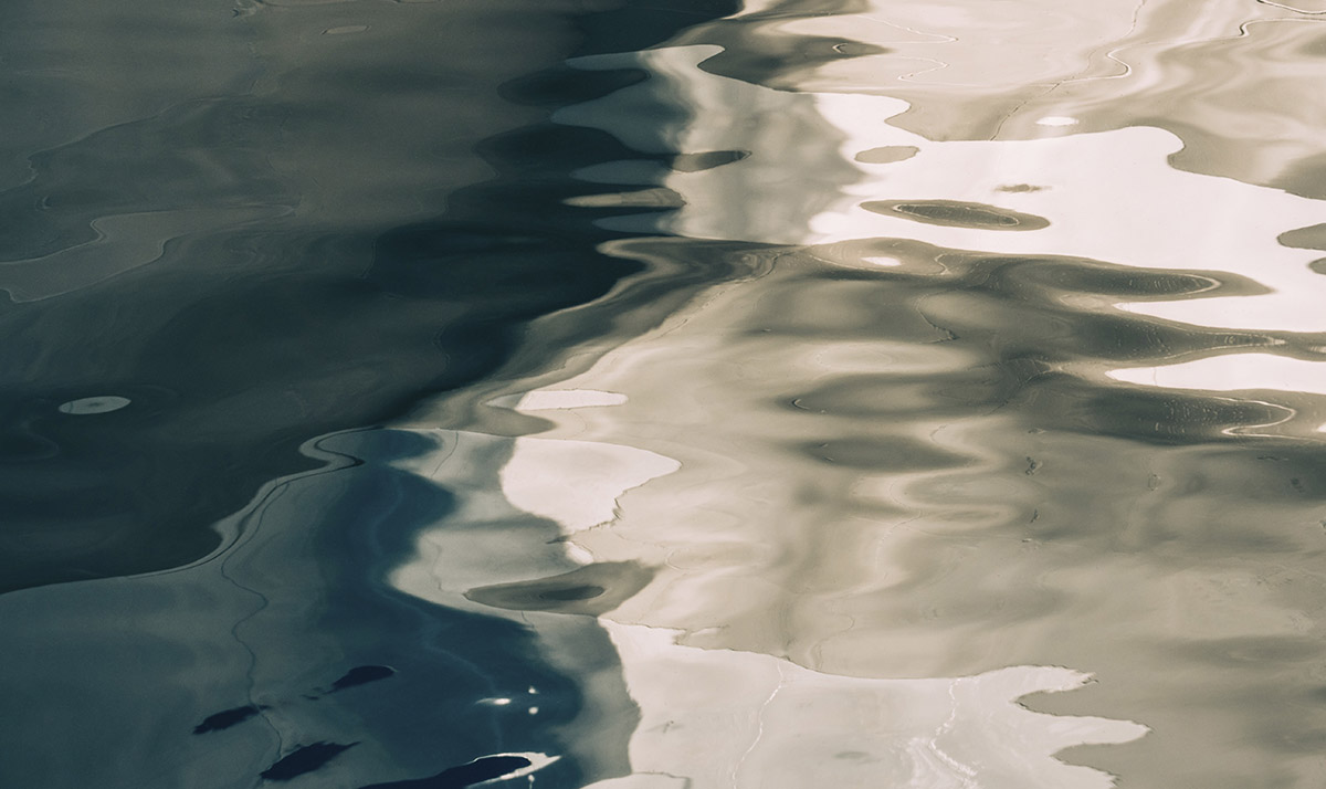 Een glinsterende zee in twee verschillende kleuren blauw groen en creme.