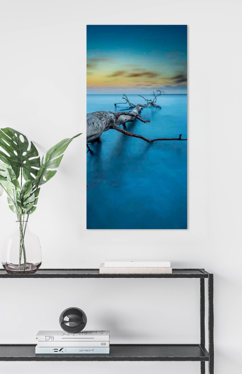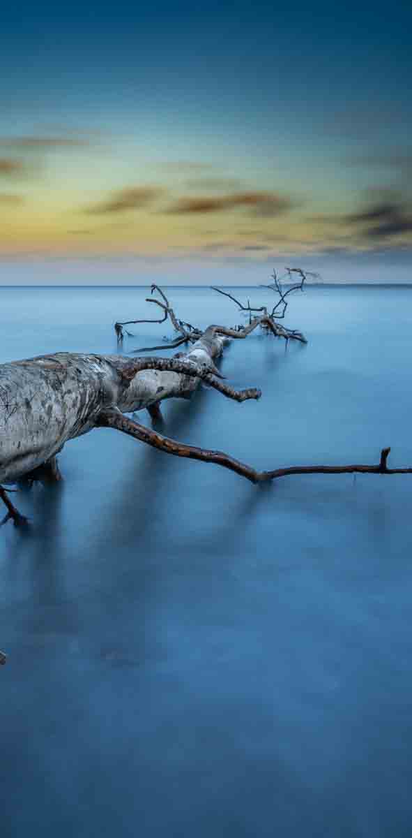 Een boom die verdwijnt in het oneindige aan het strand.