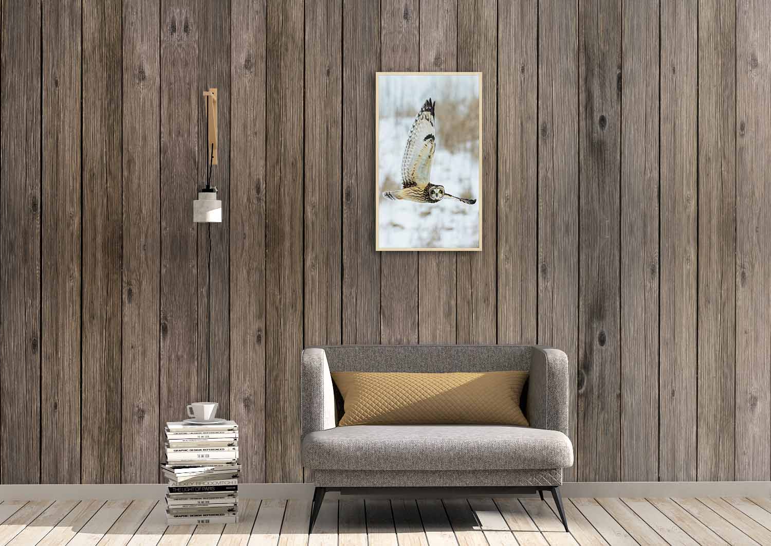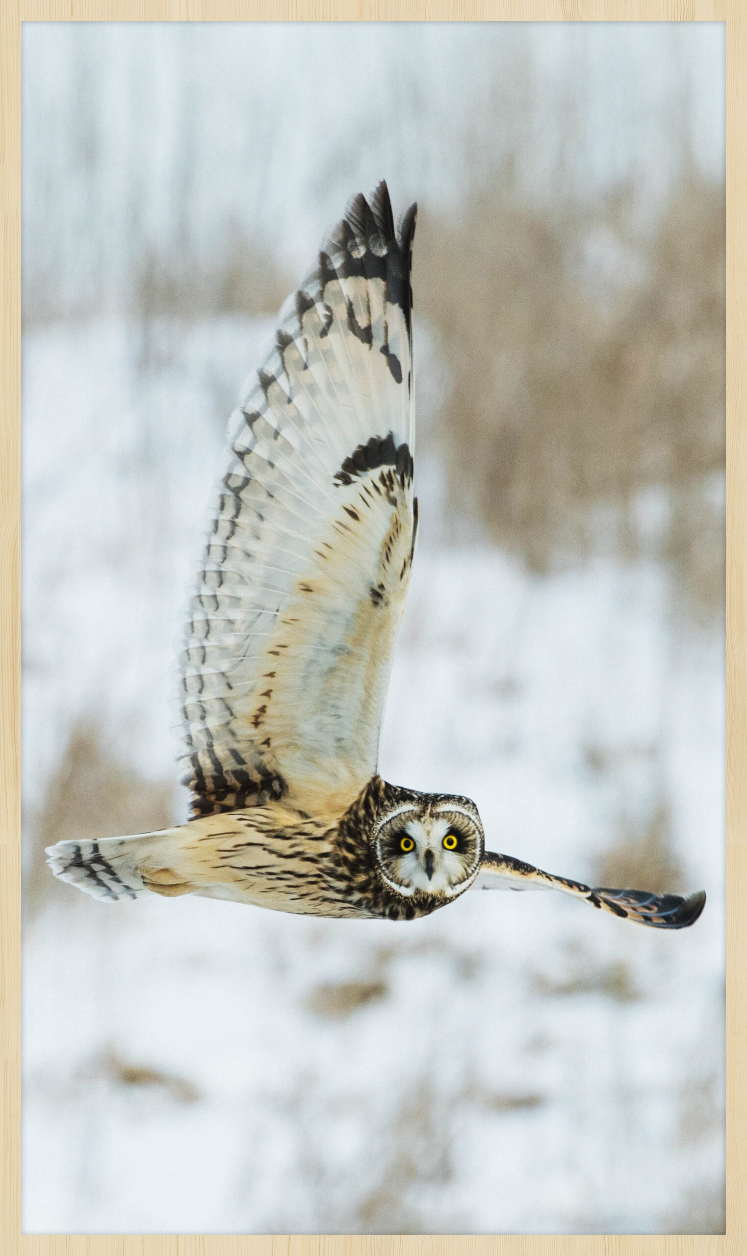Een wit met bruine uil die over een sneeuwlandschap vliegt.
