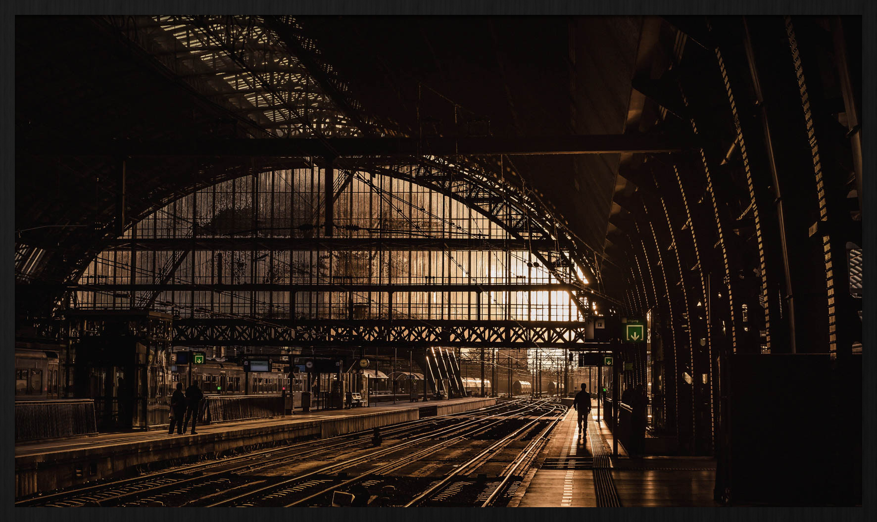 Een nostalgisch treinstation in sepia kleuren.