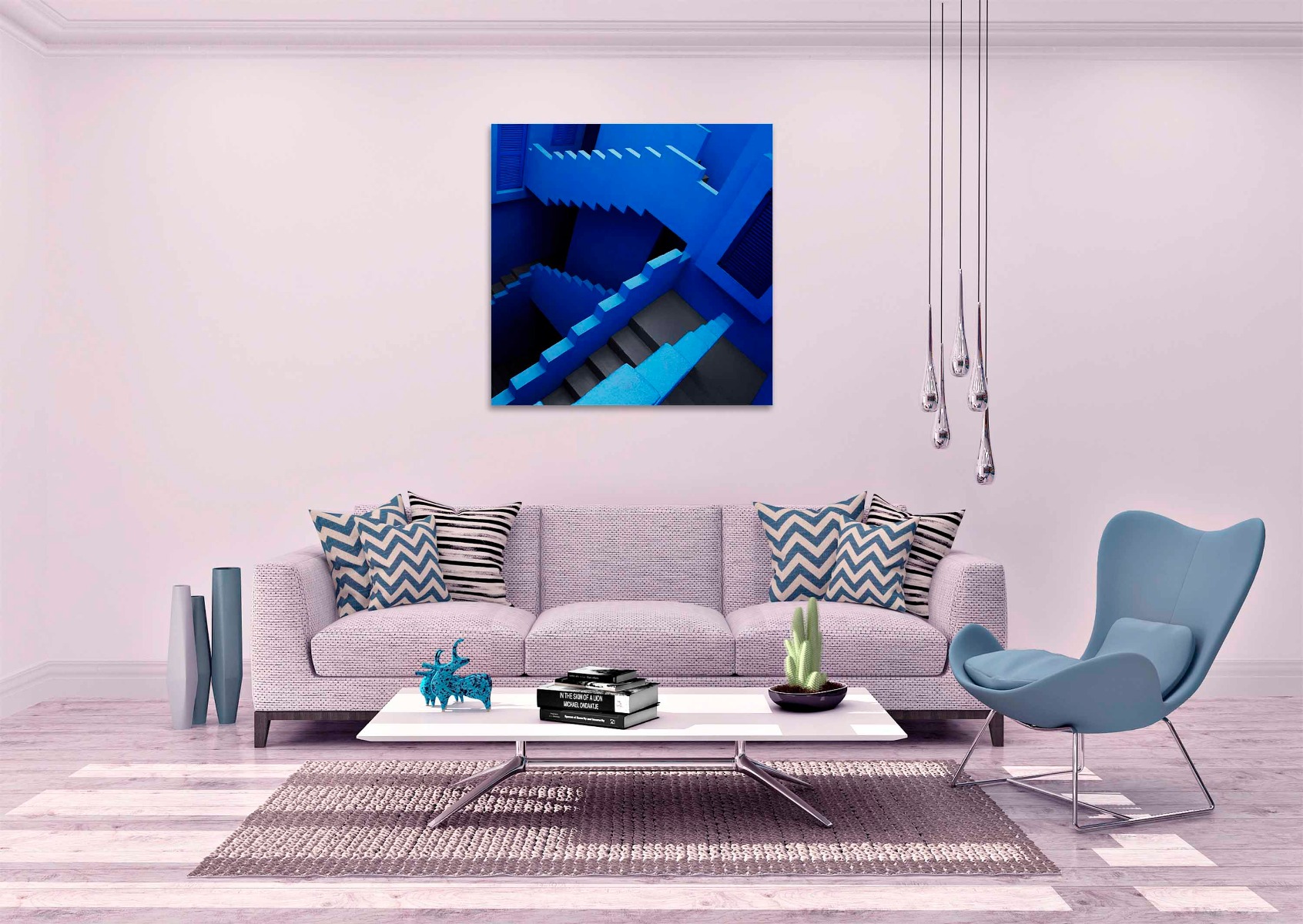 Geometric shapes in striking hues of red, blue, lilac and pink: architecture and illusion merge.
