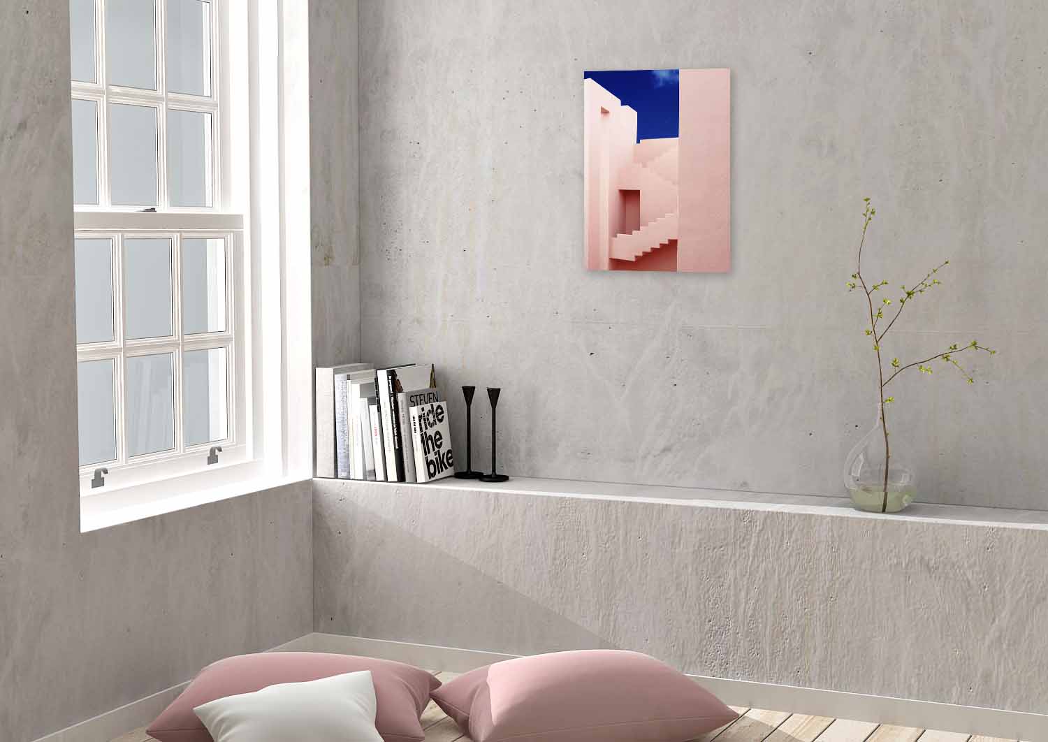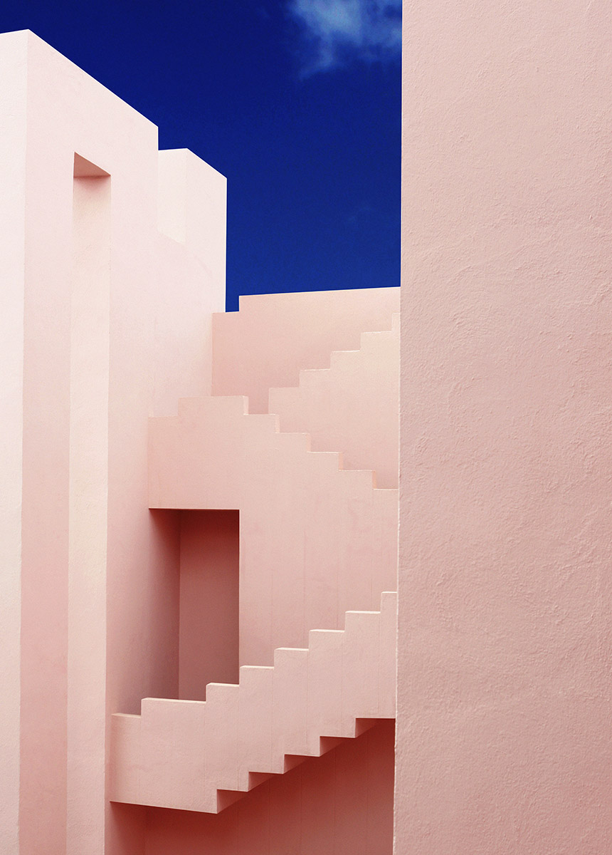 Geometric shapes in striking hues of red, blue, lilac and pink: architecture and illusion merge.