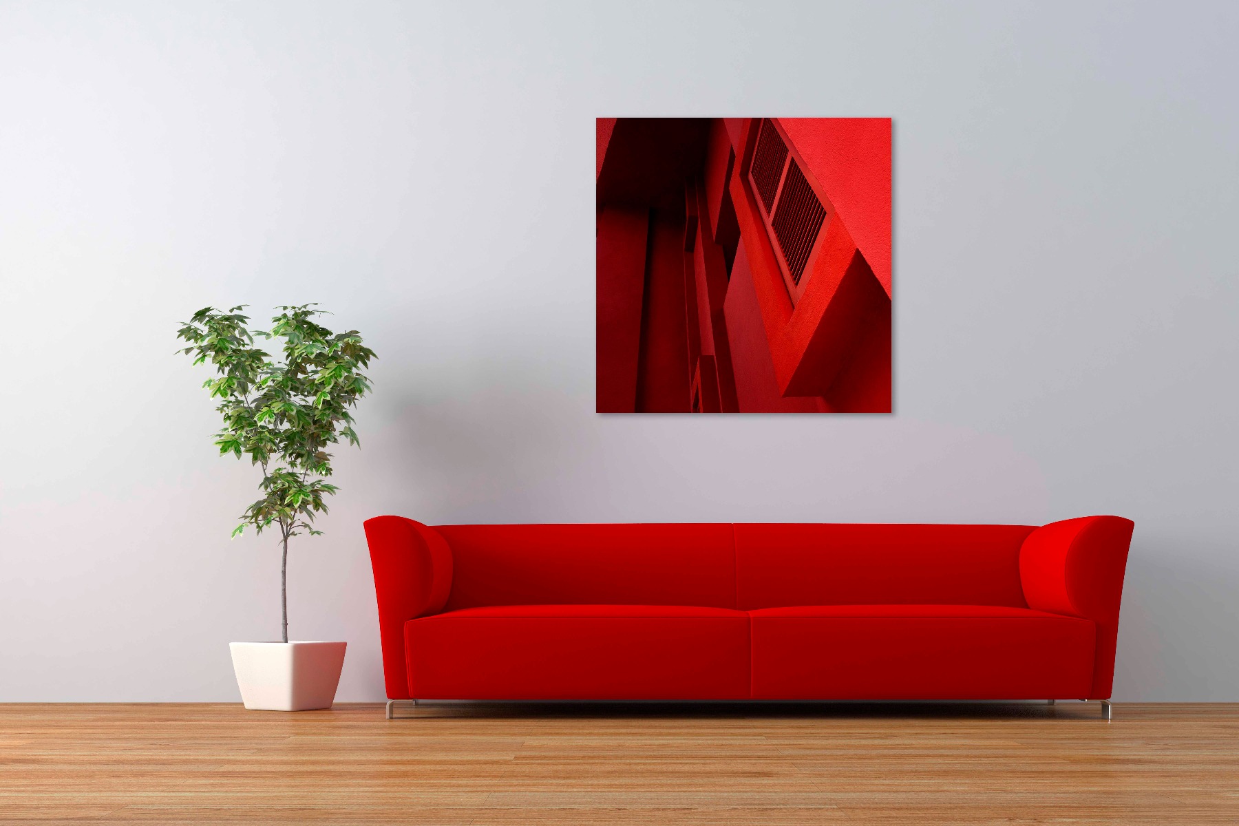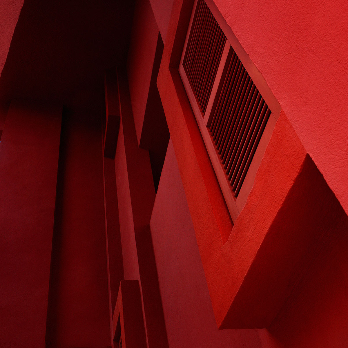 Geometric shapes in striking hues of red, blue, lilac and pink: architecture and illusion merge.