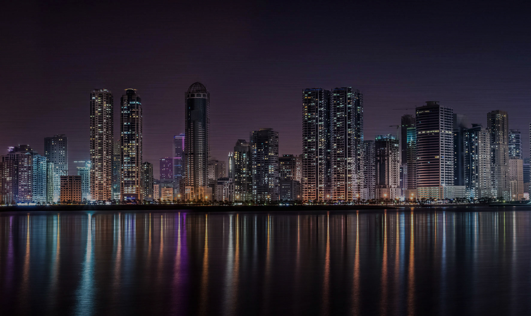 Een skyline die in het water weerspiegeld in de nacht.