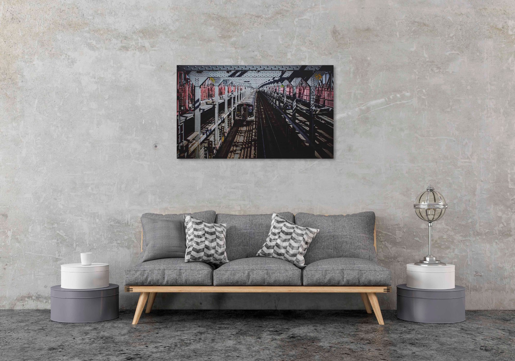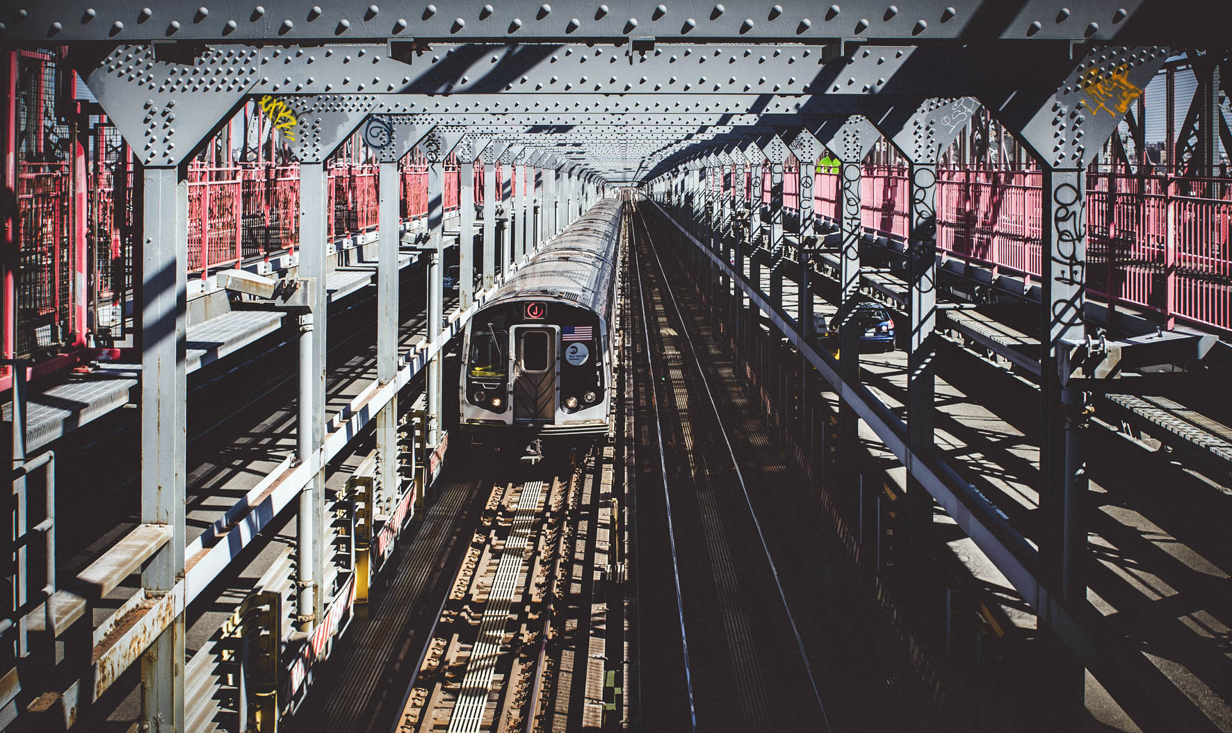 Een stalen brug waar op een metro je tegemoet komt rijden.