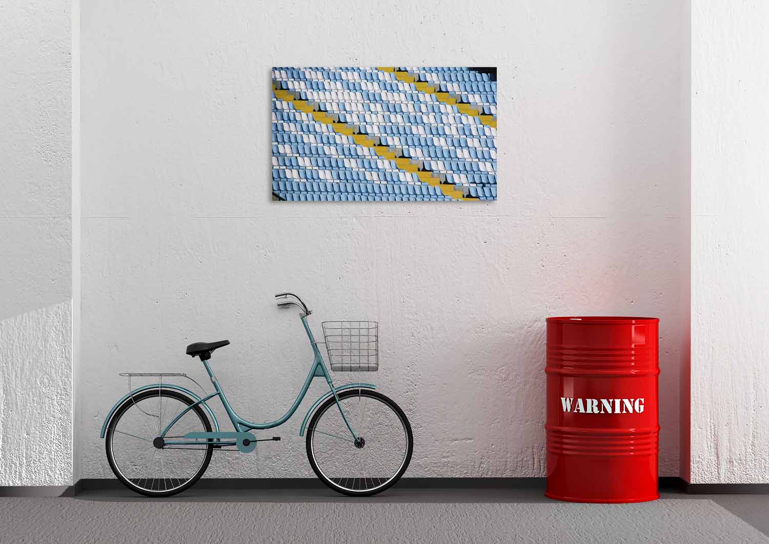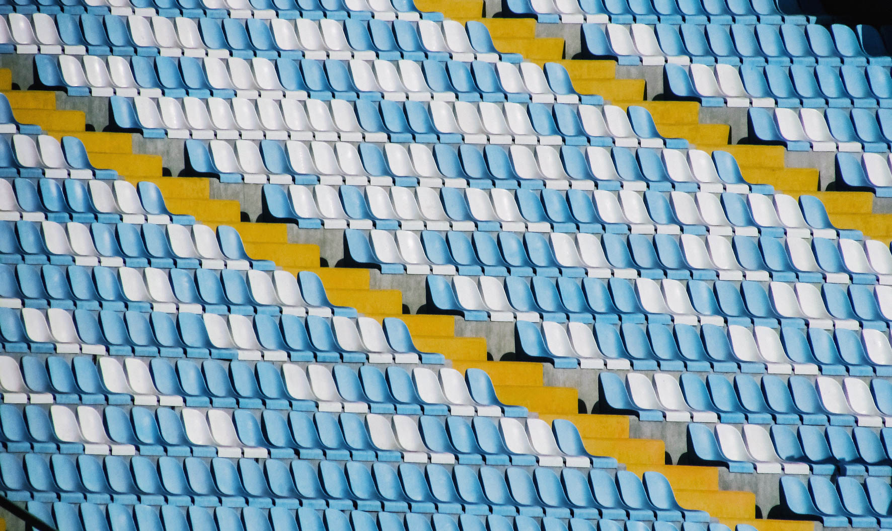Blauw met witte stoeltje op een tribune met een gele trap.
