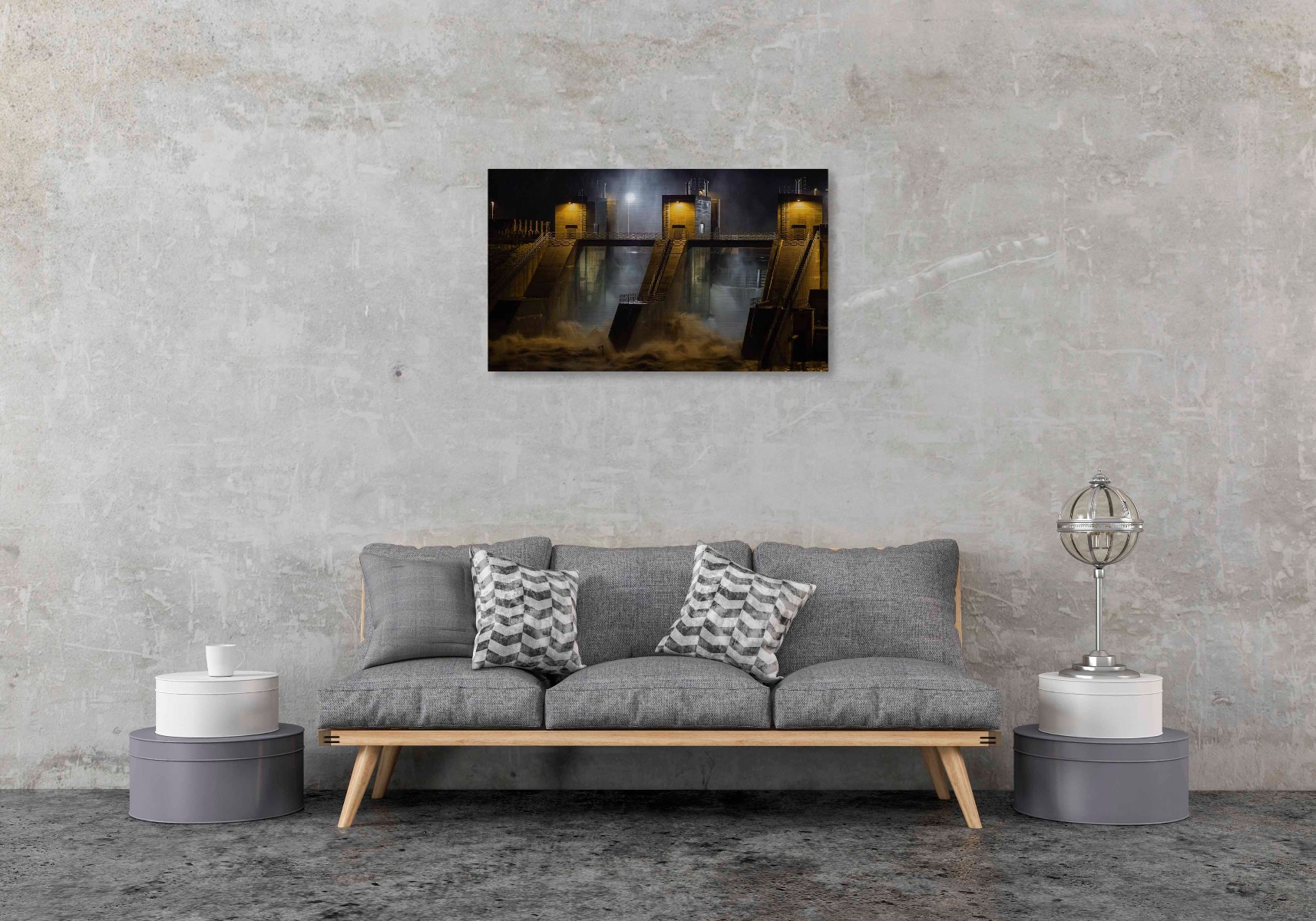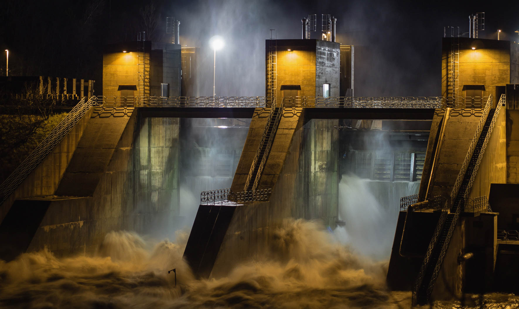 Een stuwdam meer in het donker verlicht door grote lampen.