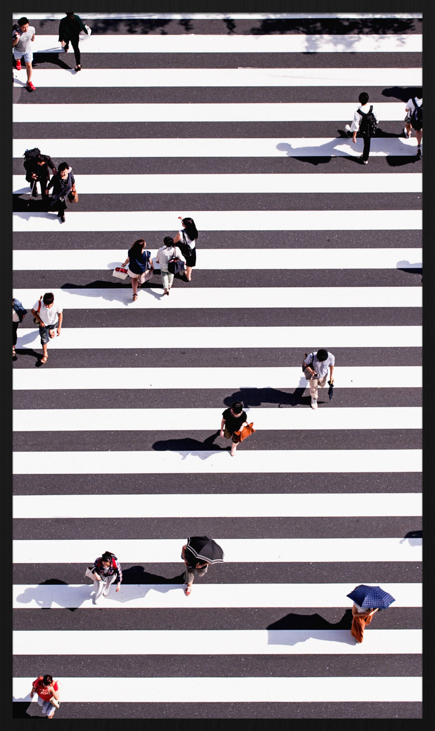 Een groot wit zebra pad met meerdere overstekende mensen erop.