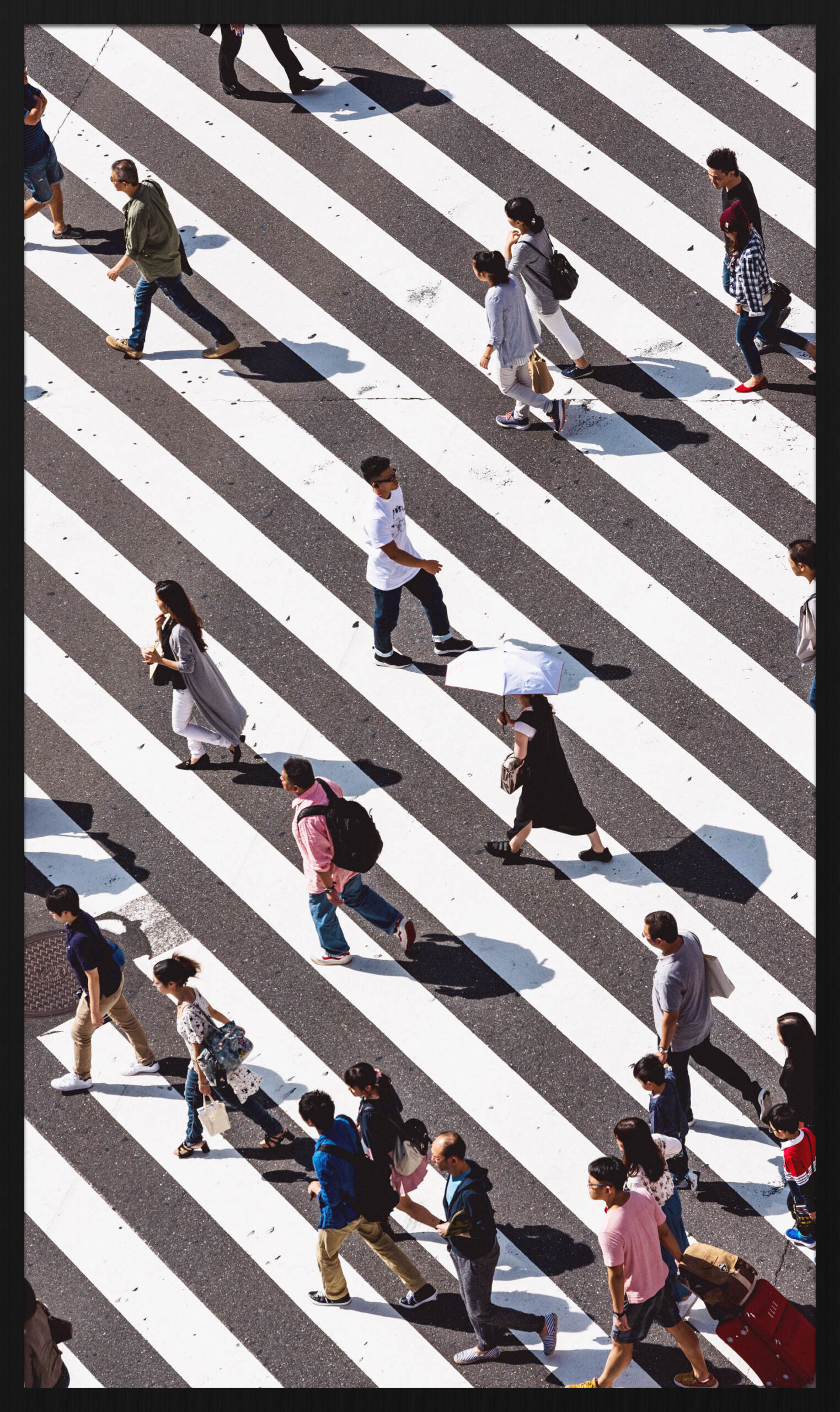 Een groot wit zebra pad met meerdere overstekende mensen erop.