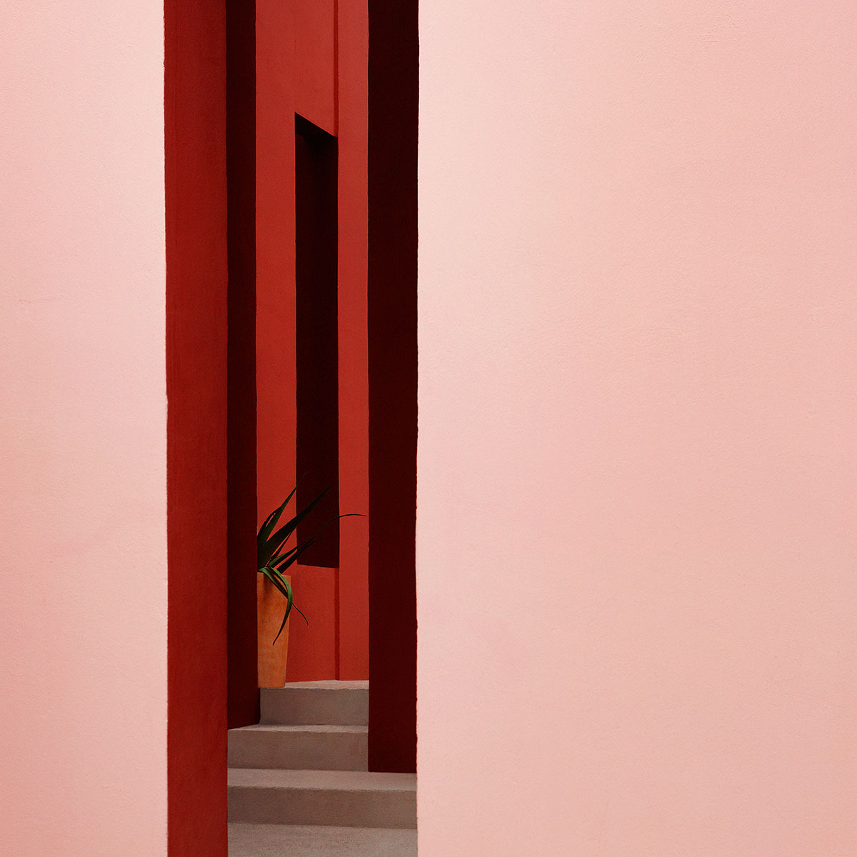 Geometric shapes in striking hues of red, blue, lilac and pink: architecture and illusion merge.
