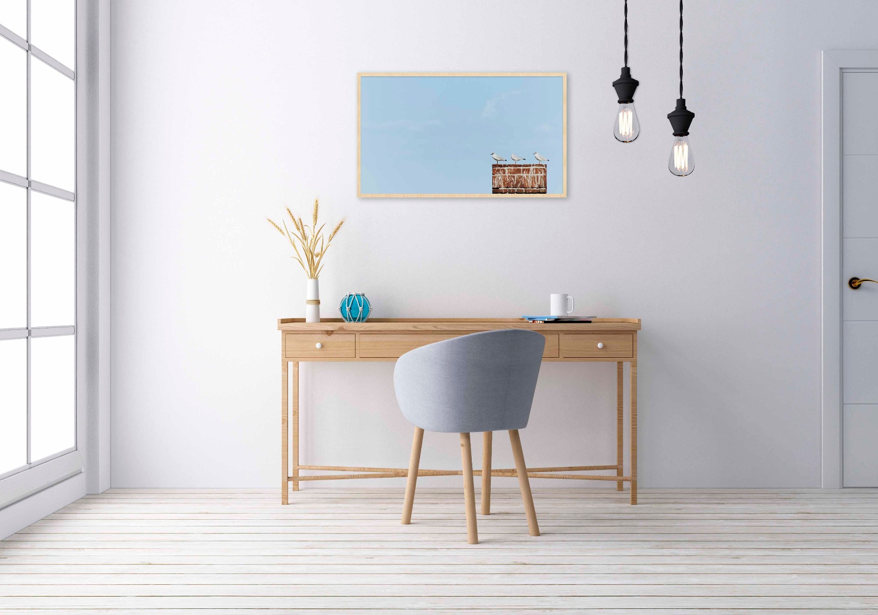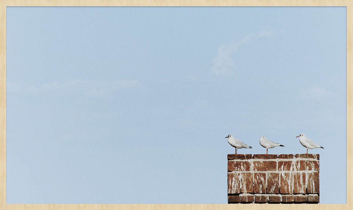 Drie meeuwen op een schoorsteen met een stralende blauwe lucht.