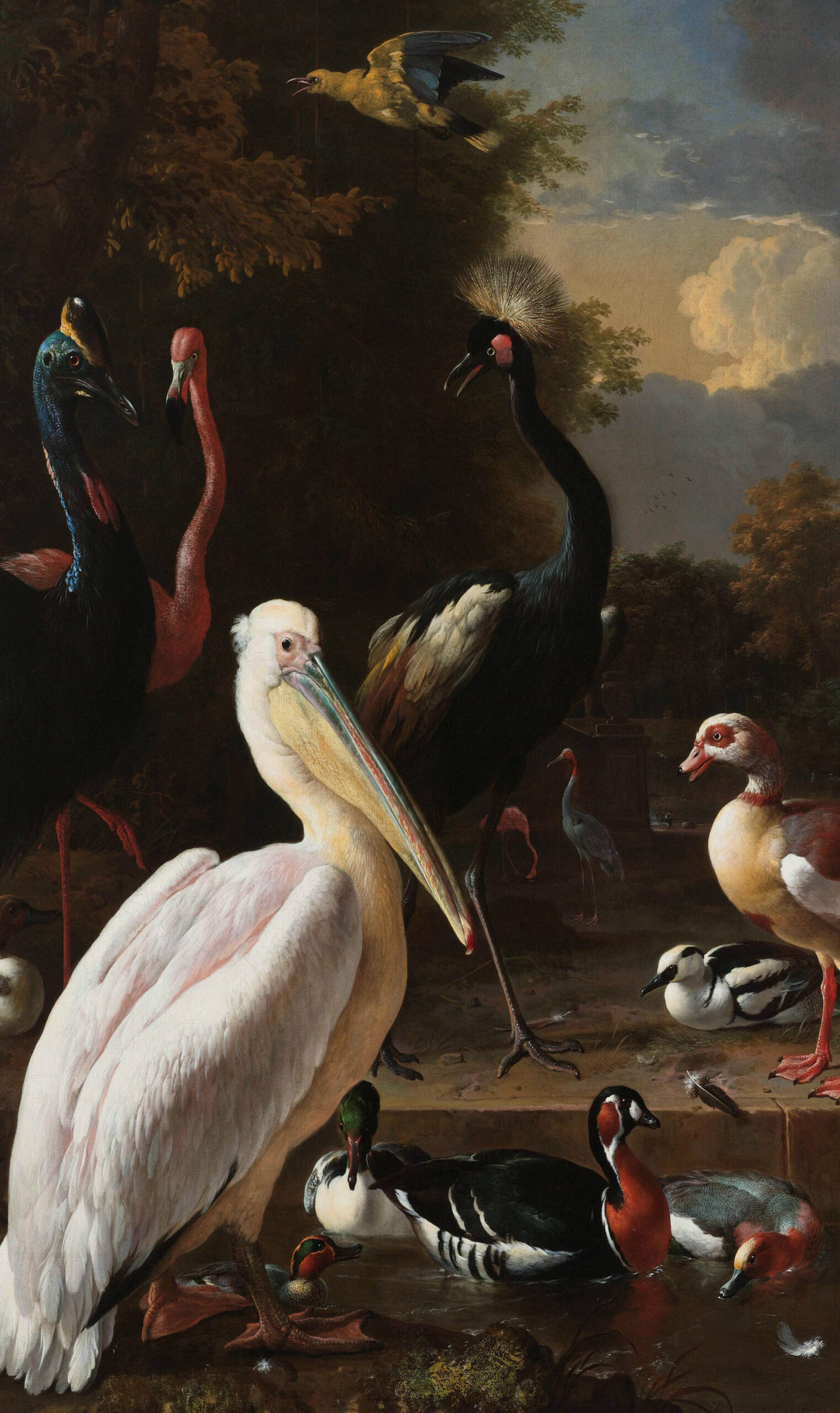 Een pelikaan en ander gevogeltje bij een waterbassin. Gemaakt door Melchior d’Hondecoeter