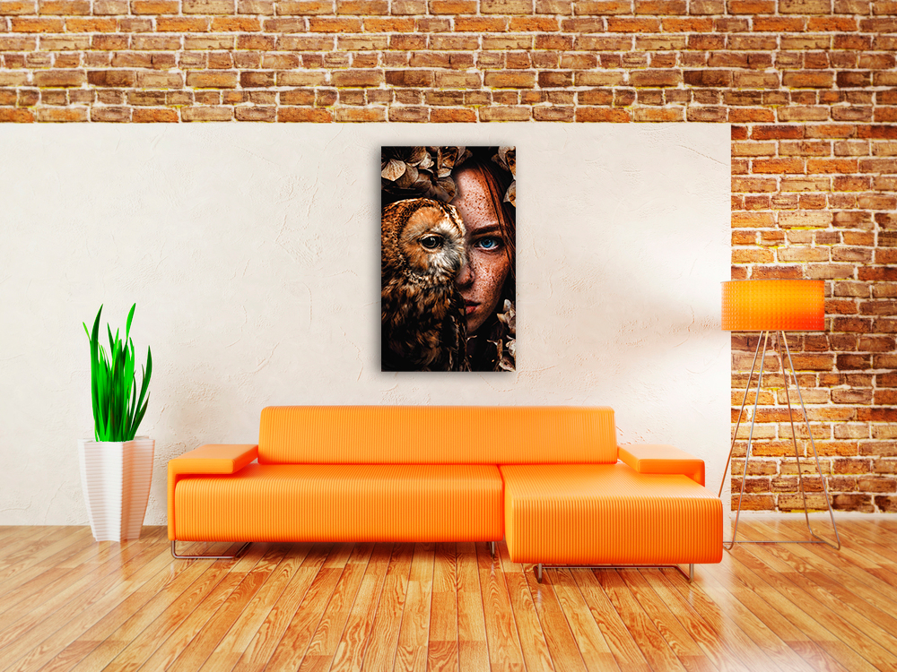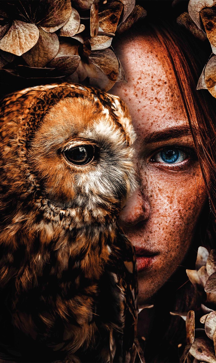 Ontwerp van een prachtig roodharige vrouw en een kleurrijke uil in een herfstachtige omgeving.