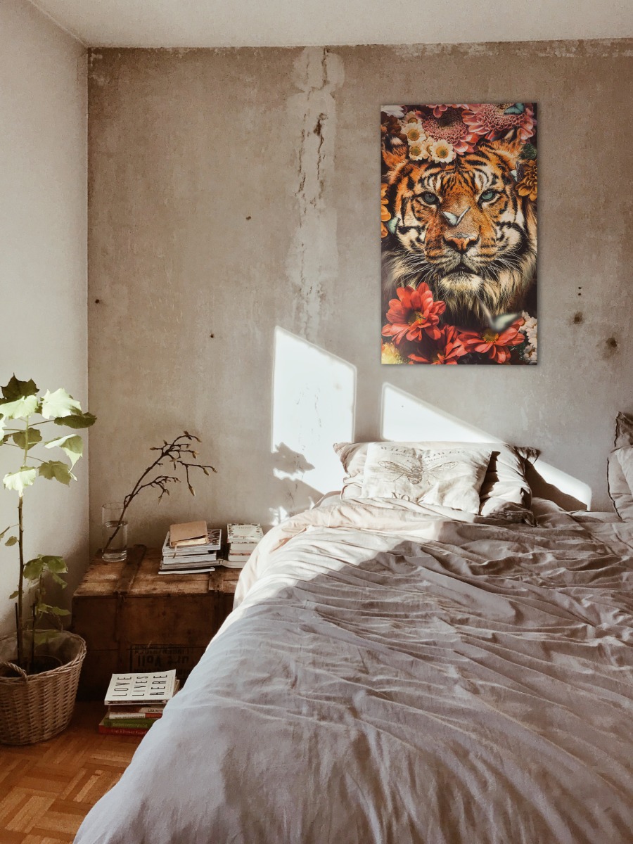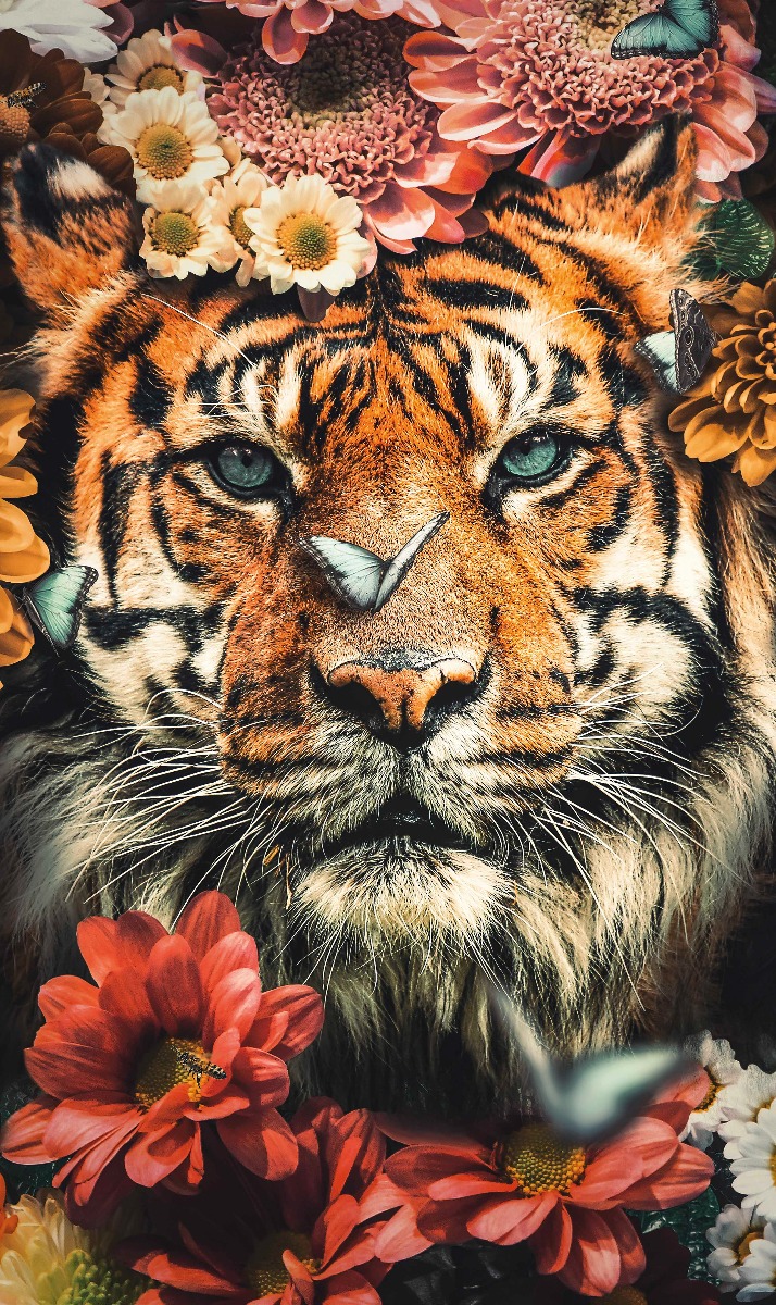 Ontwerp van de kop van een tijger omgeven door kleurrijke bloemen en vlinders.