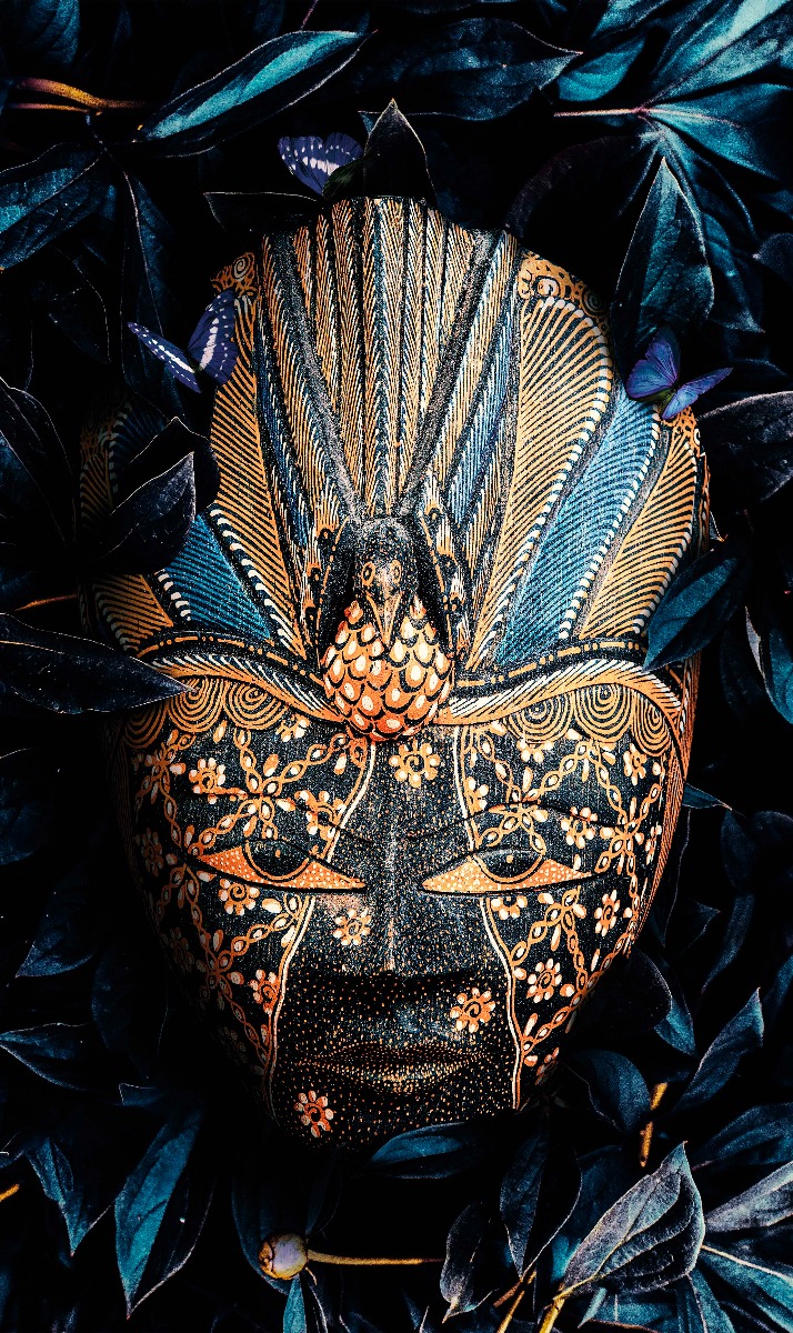 Ontwerp van een houten masker uit Maleisië omgeven met bladeren en groen. Uitgevoerd met een hoog contrast tegen een donkere achtergrond.