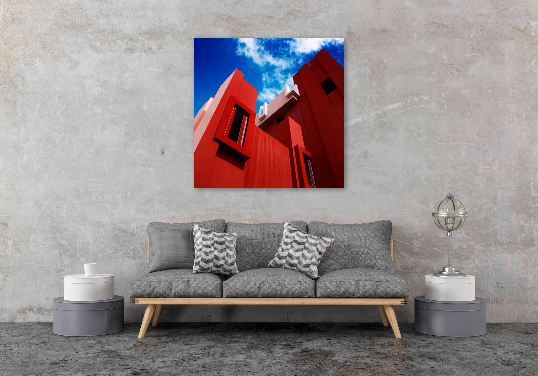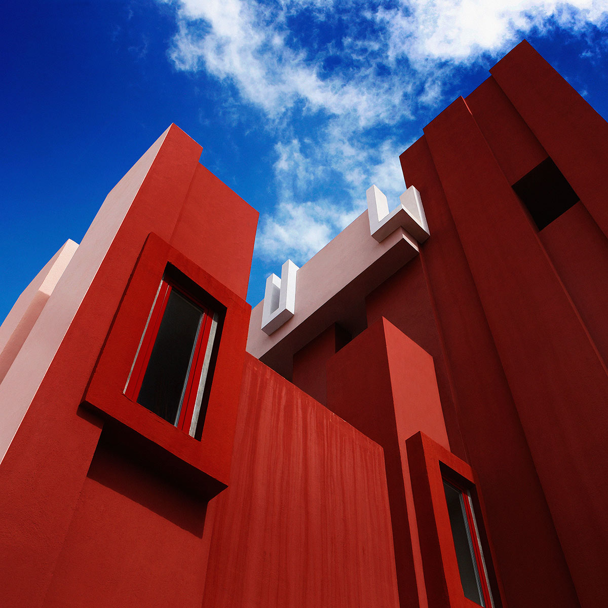 Geometric shapes in striking hues of red, blue, lilac and pink: architecture and illusion merge.