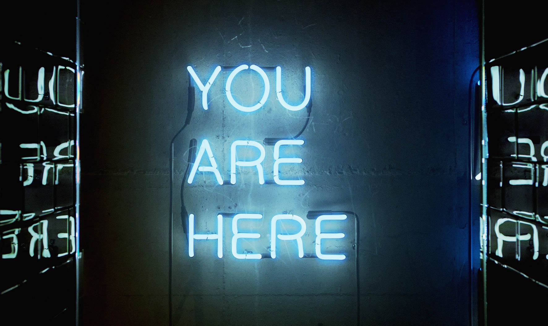 Een blauw neon bord op een betonen muur.