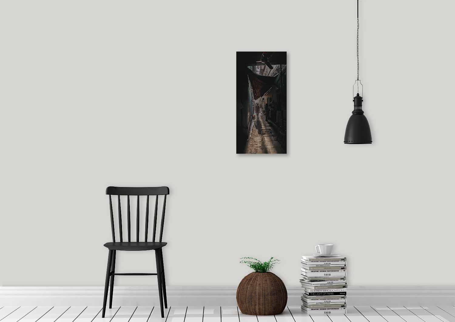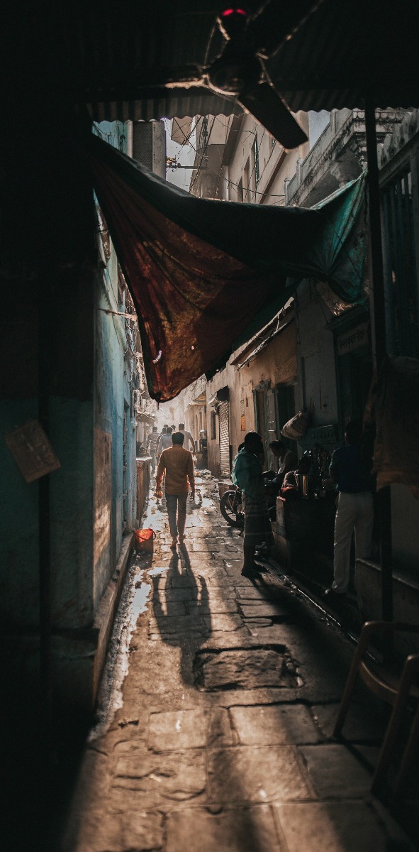 Een donker steegje met doeken die het zonlicht tegen houden.
