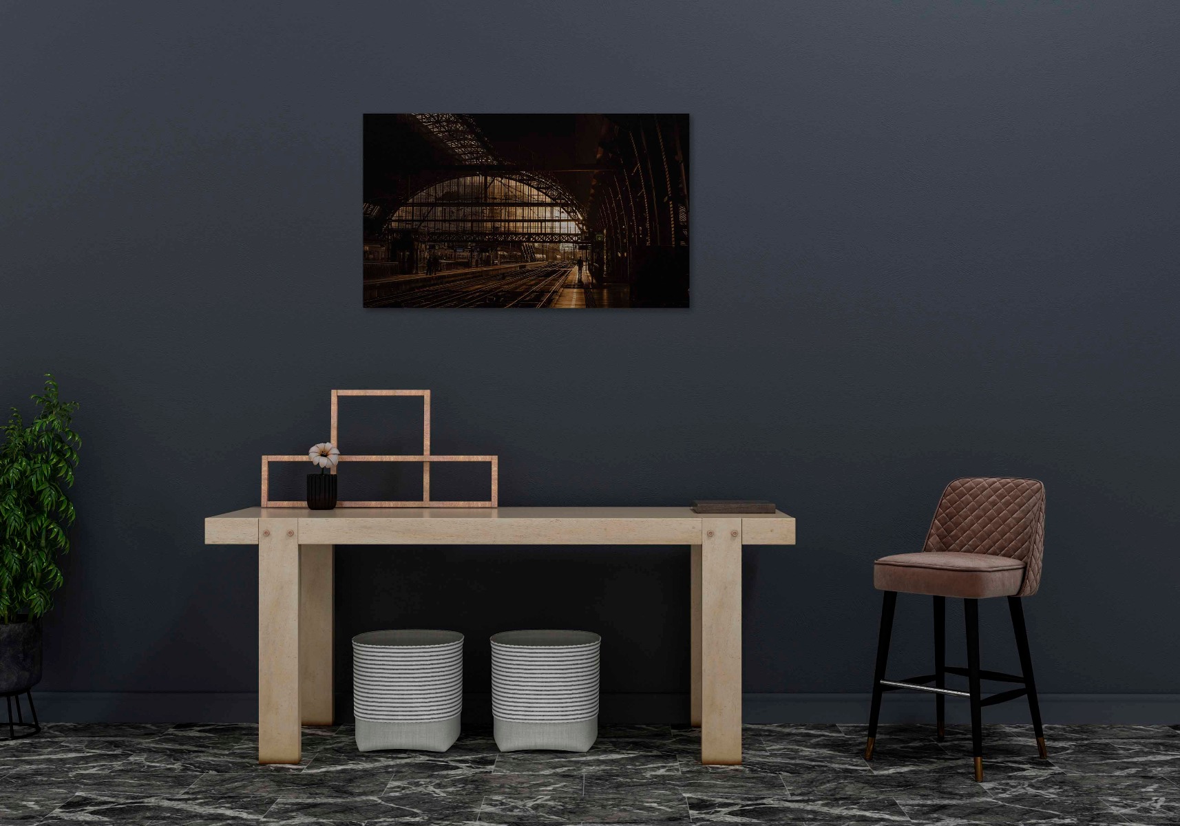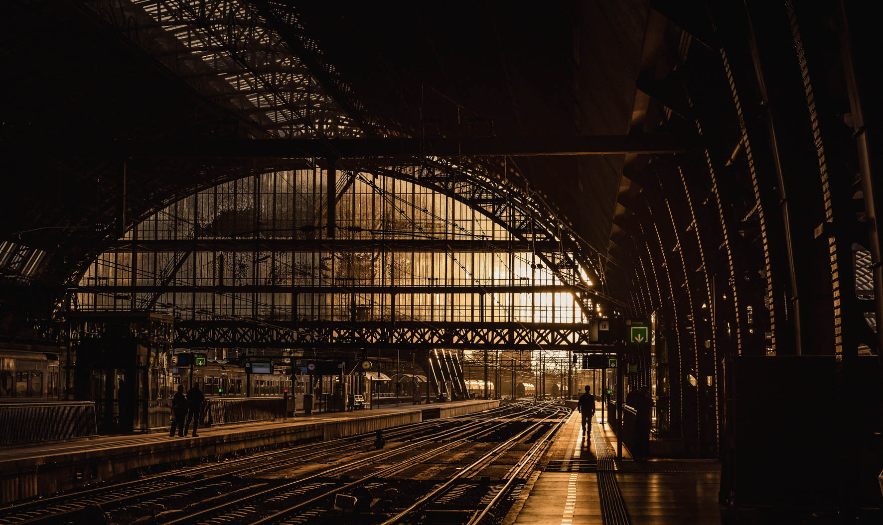 Een treinstation in goud en zwart.