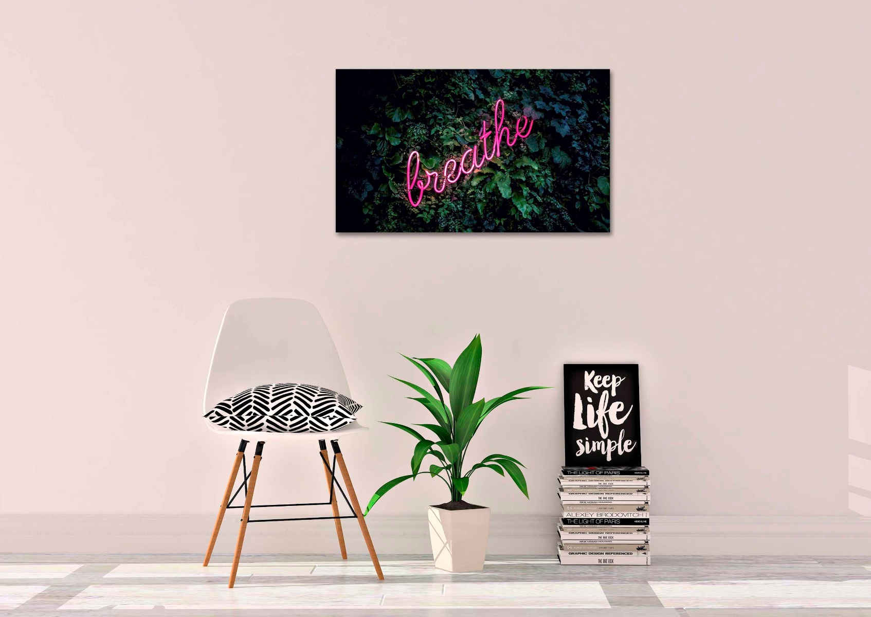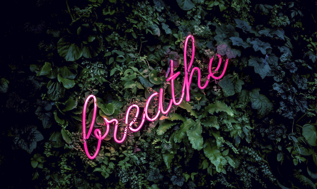 Een roze neon licht op een groene levende wand.