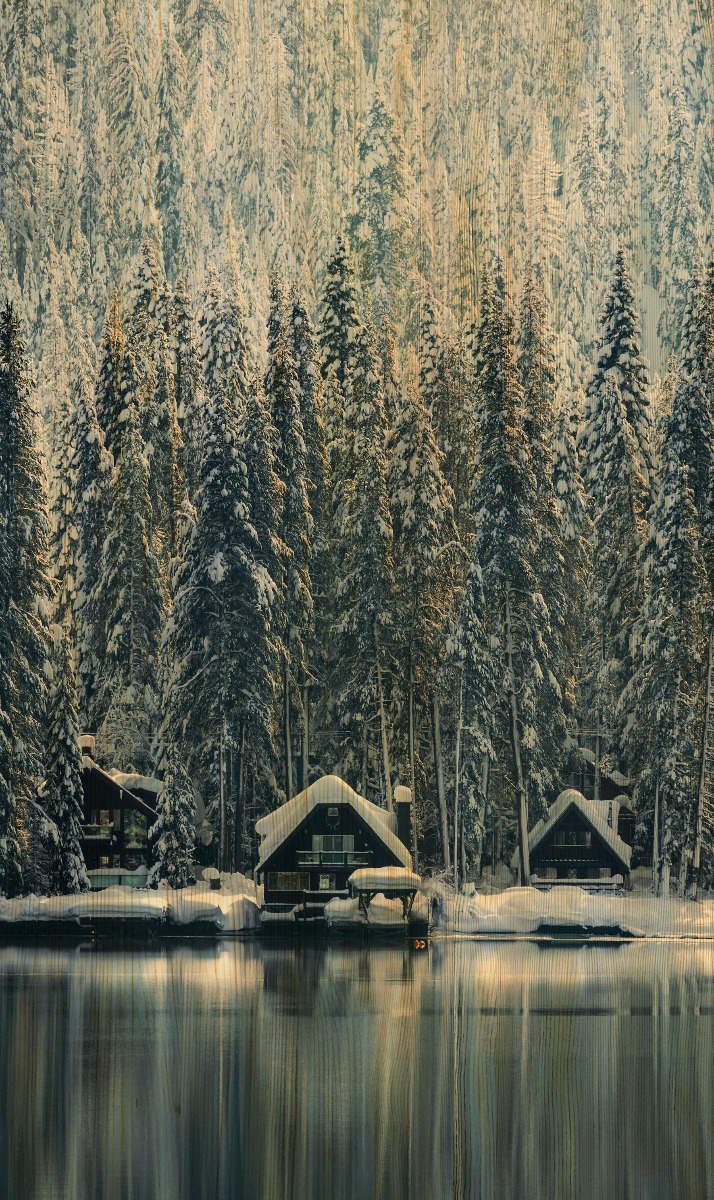 Een afbeelding van huisjes aan een meer en bomen met sneeuw op de achtergrond.