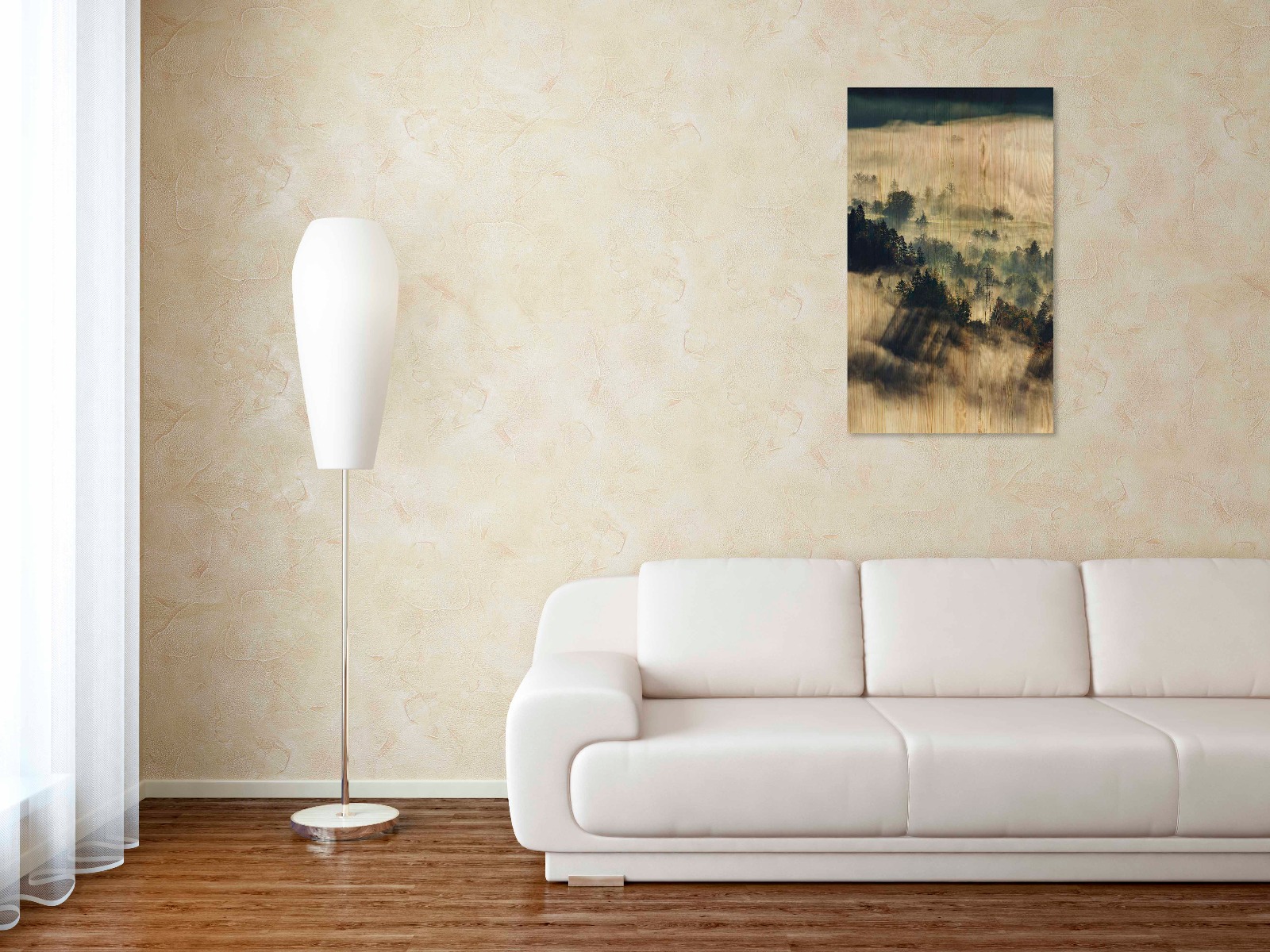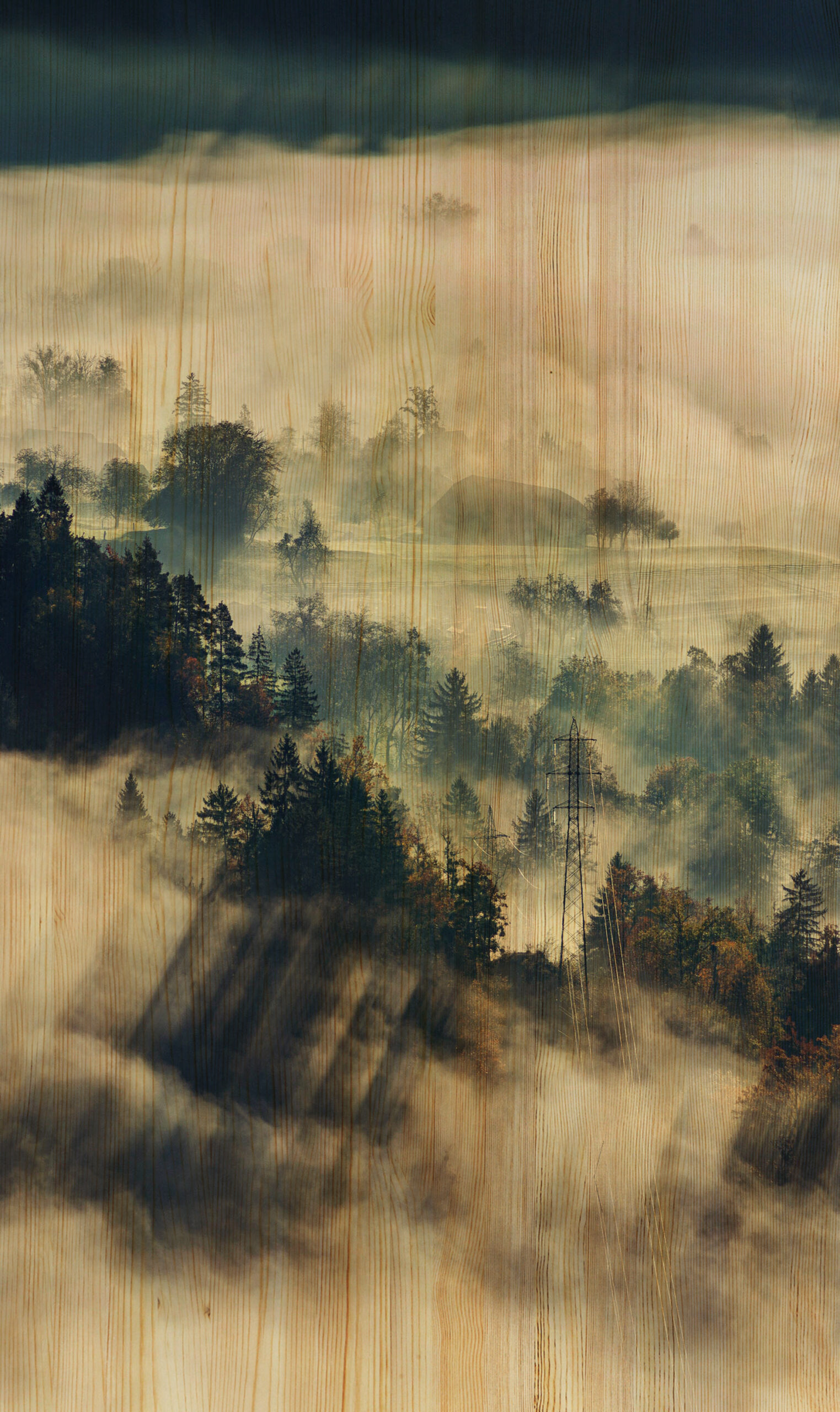 Een berglandschap vol met dennen, die rijken top in de wolken. The sky is the limit.