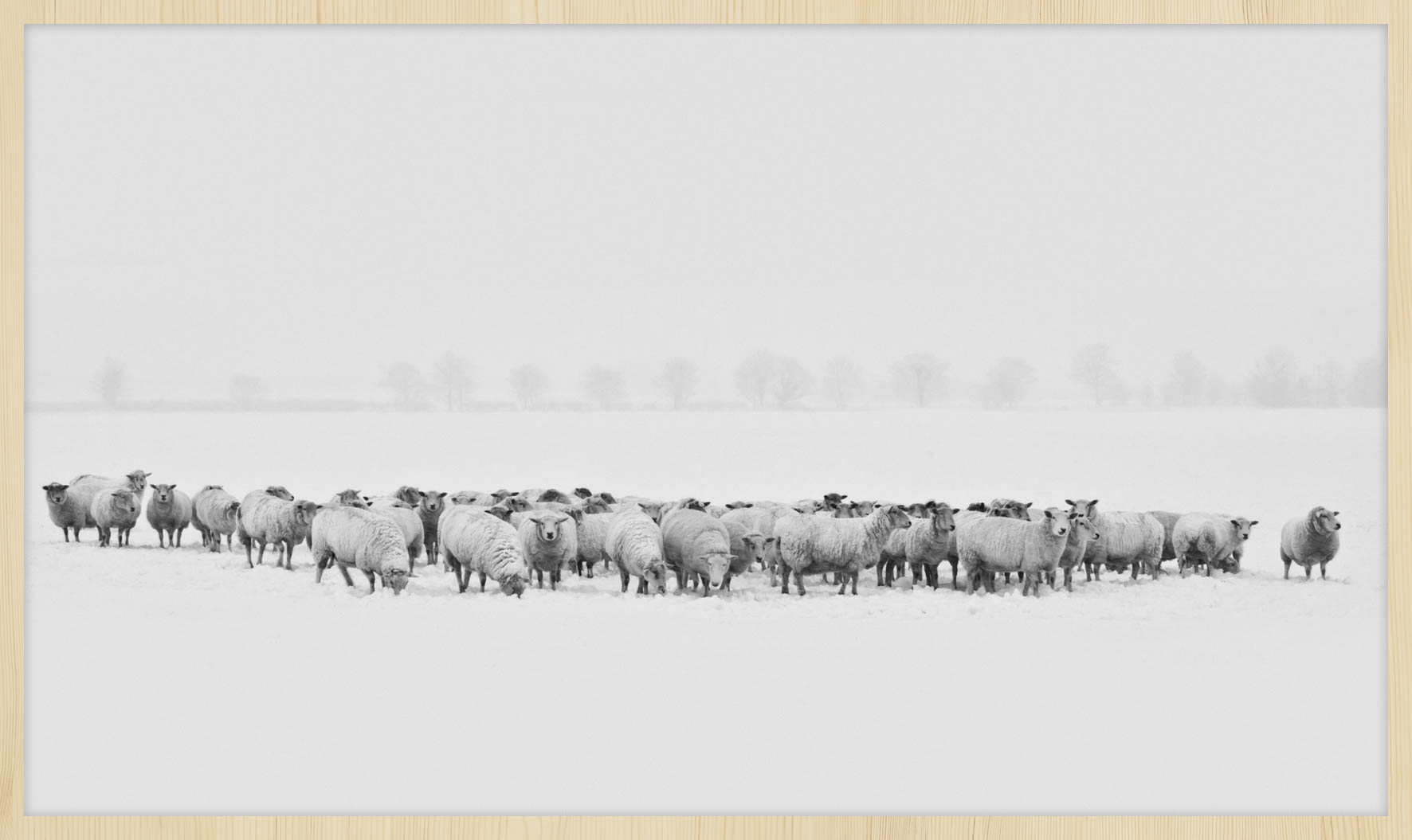 Een winterlandschap met een kudde schapen in de sneeuw.