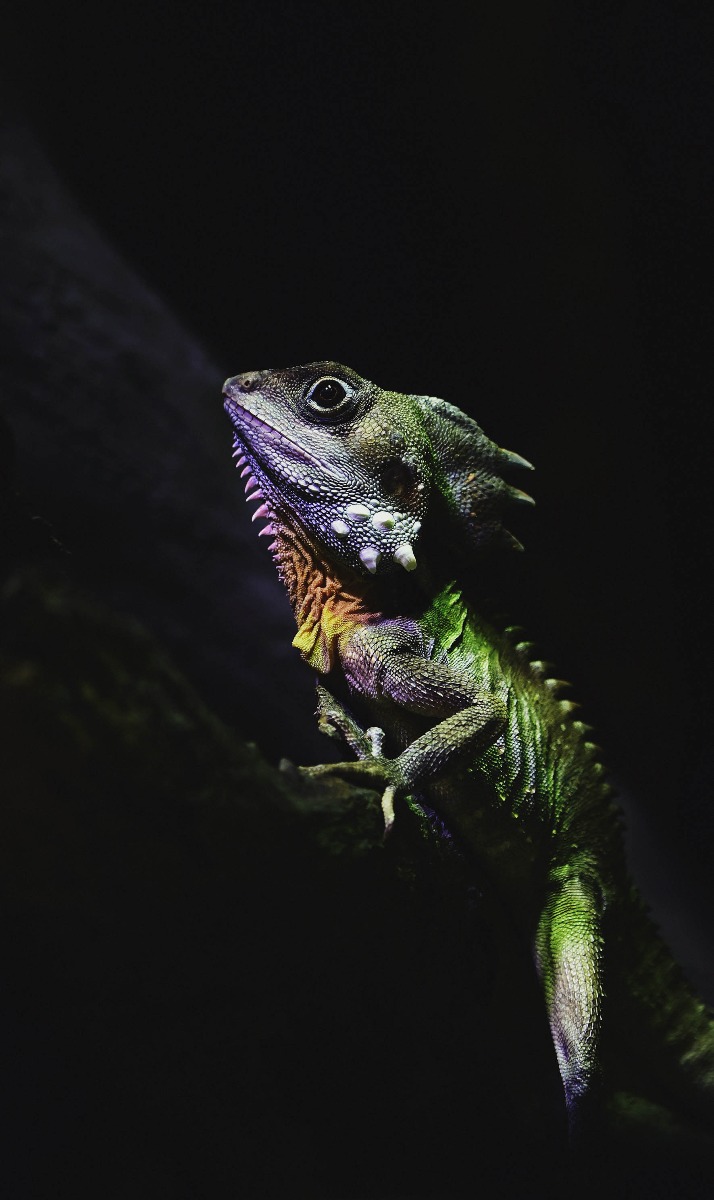 Een kameleon in donkere schutkleuren op een tak.